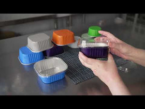 Enjoy savory appetizers or sweet desserts using our Foil Lux 4-ounce Round Gray Aluminum Baking Cups. Pair these gray baking cups with our Foil Lux matching Flat and Dome lids (SKU: RWM0089C and RWM0090C) to easily take your frosted cupcakes and sweet muffins on the go. Crafted from aluminum, these recyclable baking cups have a durable design that won't bend or break during use. These aluminum baking cups are scratch and grease-resistant. Built with a flat bottom, these aluminum cupcake liners are for even distribution of heat during baking. Easy to use and serve, these disposable baking cups can withstand hot temperatures up to 500 F and are freezer-safe to easily store prepped desserts. Featuring a classic gray finish and a textured design, these disposable baking cups add a touch of elegance to your presentation. Measuring 3.25 inches in diameter and 1.5 inches in height, and contains up to 4 ounces of batter or dough. Sold in a 100 count box. Lids available and sold separately.