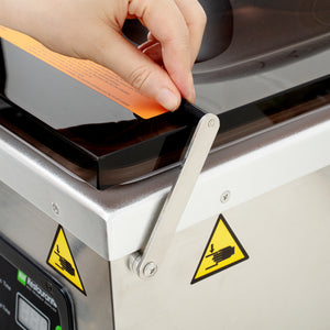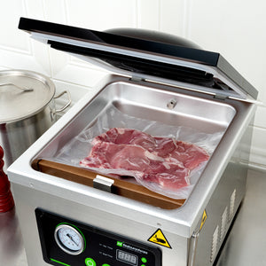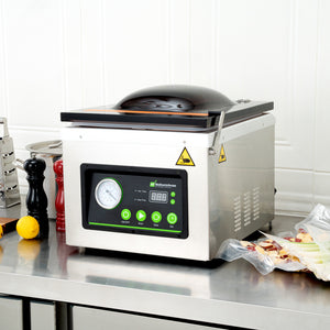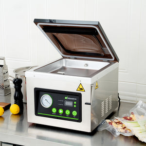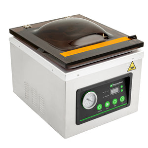 Expertly seal your food for later use with our Fresh Hero Stainless Steel Chamber Vacuum Packaging Machine. This food saver vacuum sealer includes a removable 12-inch bar to keep our matching Fresh Hero vacuum packaging bags tightly sealed. Featuring an oil pump, this food sealer stays quiet during operation to avoid disturbing patrons when conversing. With a built-in control panel, this vacuum packaging machine is easy to use, so you can effortlessly seal ingredients. The transparent lid of this commercial vacuum sealer provides a view of the packaging process for ensuring food is sealed to your liking. Crafted with a stainless steel body, this vacuum packaging machine is strong and sturdy for using it over and over again. With 120V and a NEMA 5-15P plug, this vacuum food sealer is compatible with standard U.S. power outlets. Measuring 16.8 inches long by 14.1 inches wide by 14.4 inches tall, this food sealer machine has 2/5 horsepower. Sold in a 1 count box. Fresh Hero vacuum packaging bags are available and sold separately.