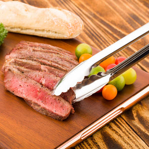 Tackle any kitchen task with these Met Lux Heavy Duty Stainless Steel Tongs. Measuring 16 inches long, these large kitchen tongs are the perfect size for turning steaks on the grill, rotating pork chops in a saute pan, transporting roasted vegetables from the oven, or serving prepared foods from steam table pans. Their scalloped edges provide an extra-firm grip on your foods, while their durable stainless steel construction ensures high-volume commercial use. Equipped with non-slip rubber grips, these stainless steel kitchen tongs make it simple for you to get a secure and comfortable grip every time. Ideal for restaurants, catering companies, and other commercial kitchens, these heavy duty food tongs are shipped in a 1 count box.