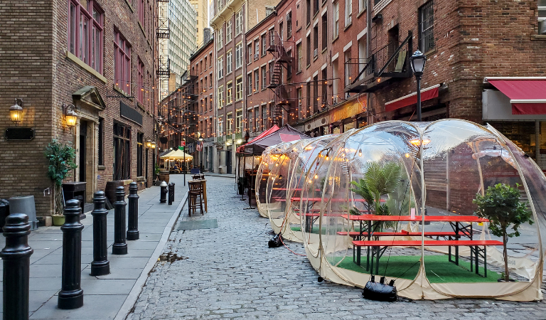 Although restrictions have eased up across the country, social distancing guidelines and precautions will be heavily encouraged for the foreseeable future. The pandemic has drastically changed the look of restaurant interiors and exteriors. Indoor dining closures forced operators to take their tables outside and create outdoor dining spaces. Large amounts of tables were replaced with fewer tables spaced out throughout the dining area. Bars have transitioned from traditional bar seating to lounge-style seating. Many restaurants even got rid of their indoor dining rooms in favor of a larger kitchen and pick-up area for orders.