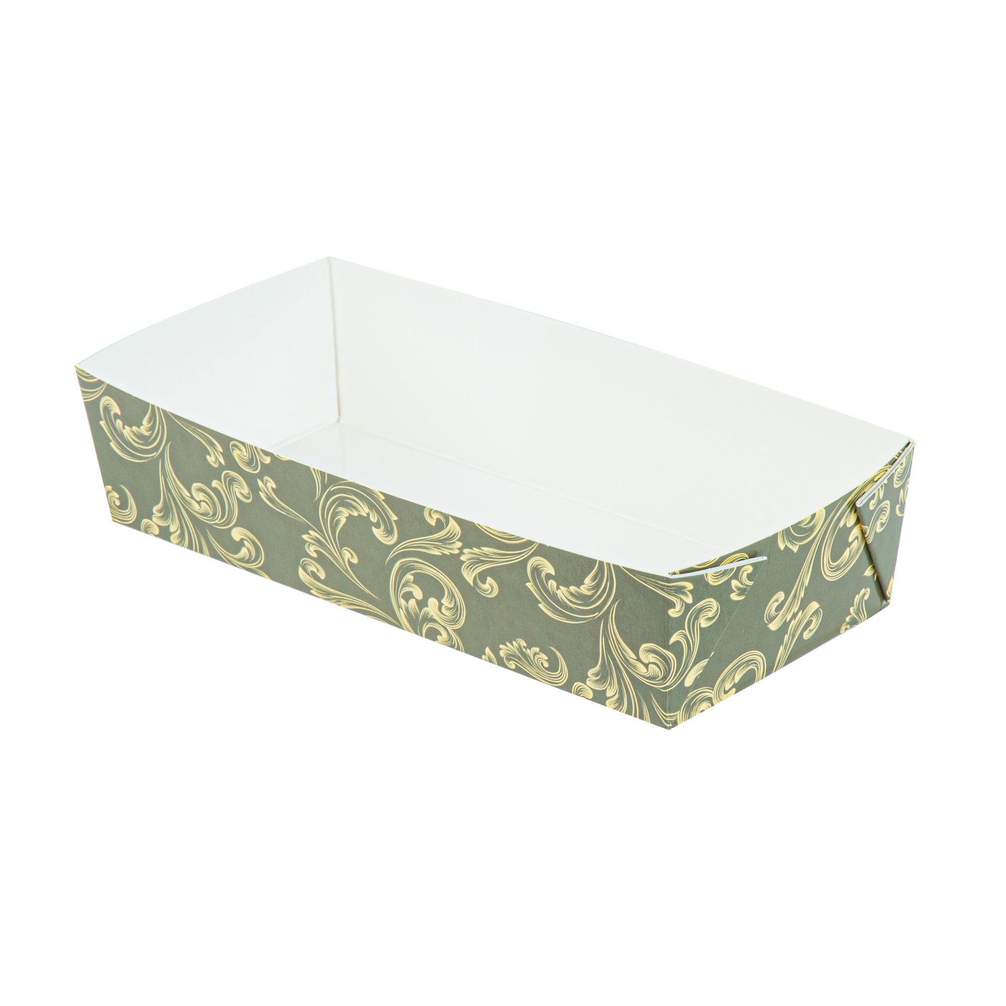 Bake Tek 13 oz Dark Green Vintage Floral Paper Baking Tray - Greaseproof - 10 3/4" x 3 1/4" x 1 1/2" - 100 count box10 3/4" x 3 1/4" x 1 1/2"RWA1801G
