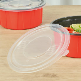 Bento Tek 42 oz Round Red Plastic To Go Box - Microwave-Safe - 7" x 7" x 3 1/4" - 200 count box7" x 7" x 3 1/4"RWP1918R