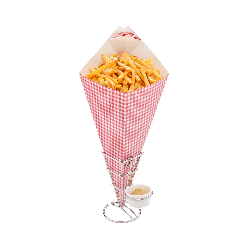 Crafted with durable, heavyweight paper, our selection of paper cones is a sturdy option for single-use events and can hold hefty amounts of food without falling apart. With a greaseproof lining, guests can enjoy their delicious fries, popcorn, and chicken tenders without worrying about soggy stains. Some of our food cones include built-in dipping pockets for adding convenience while serving. Mix and match different sizes and styles to create memorable appetizer and dessert arrangements.