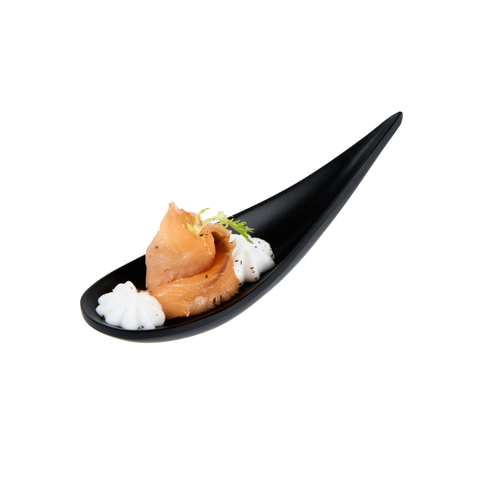 Voga 1 oz Black Melamine Tasting Spoon - Japonais, Curva - 5 3/4" x 1 1/2" x 1" - 10 count box5 3/4" x 1 1/2" x 1"RWP0513B