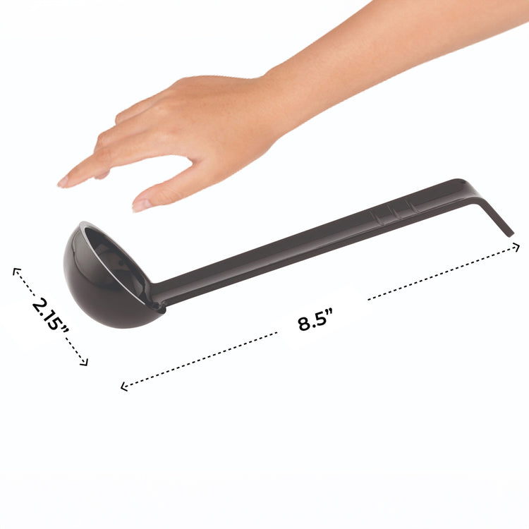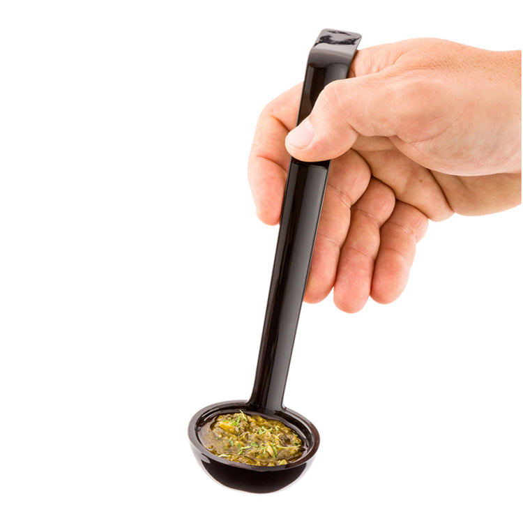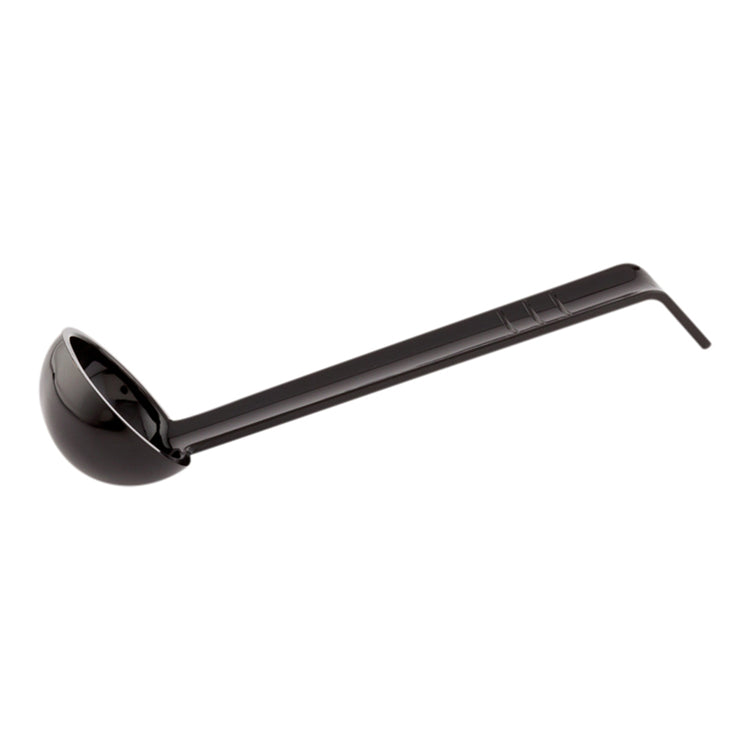 Serve gravy over turkey and mashed potatoes with our Voga 1-ounce Black Plastic Sauce Ladle. Featuring an angled design, this gravy ladle increases the distance between the sauce-filled bowl and employee uniforms to prevent unsightly stains. The built-in hook of this pizza sauce ladle can be placed on the rim of a pot so you can always keep it nearby while cooking. Featuring a deep bowl, this sauce ladle controls portion size and fills sauce cups without making a mess. Made from high-quality plastic, this small sauce ladle is dishwasher-safe for a fast and easy cleanup at your buffet, restaurant, or catering service. With a stylish black finish, this gravy ladle complements your serveware and dishware. This black ladle measures 8.5 inches in length and contains up to 1 ounce of dressings and sauces. Sold in a 1 count box.