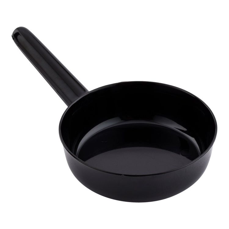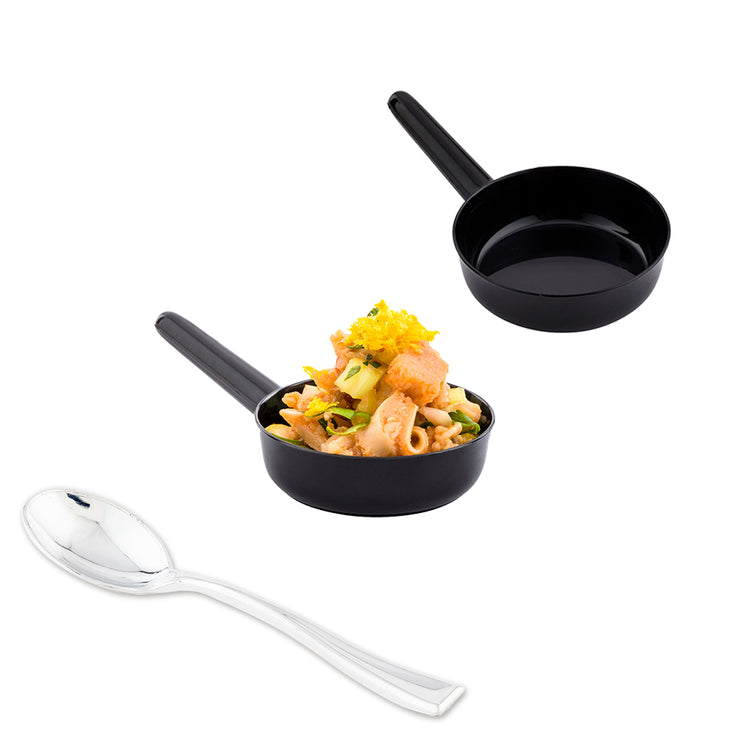 Elevate your culinary presentations with our Bundle: Mini Serve 100 1-ounce Round Black Plastic Mini Sauce Pans with 100 Silver Plastic 4-inch Mini Spoons, offering a stylish and functional solution for serving miniature delights. This bundle includes sleek black plastic mini sauce pans and shiny silver plastic spoons, designed to complement each other and enhance your culinary creations. Made from premium plastic, these appetizer cups and spoons are durable, ensuring they do not crack or warp for reliable use. The long handles on these sauce pans enable easy handling. With an elegant black finish and extraordinary design, these dessert cups are a great conversation starter. With a shiny silver finish, these plastic spoons effortlessly complement your tantalizing dishes. The sturdy handle of these 4-inch spoons can withstand hefty bites of polenta and bog scoops of gelato. For an easy cleanup, these disposable cups and spoons can be discarded after use. These plastic cups measure 3.25 inches in length by 2 inches in width and can hold up to 1 ounce. Each order includes 100 mini sauce pans and 100 mini spoons.