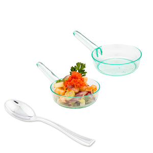Elevate your event presentations with our Bundle: Mini Serve 100 1-ounce Round Seagreen Plastic Mini Sauce Pans with 100 Silver Plastic 4-inch Mini Spoons, offering a charming solution for serving delectable miniature bites. This bundle includes mini sauce pans and the mini spoons. Crafted from premium plastic, these dessert cups and spoons are durable, ensuring they do not crack or warp easily. The innovative design of these plastic cups, featuring long handles, allows for easy carrying. With a clear finish, these appetizer cups showcase the colors and textures of your culinary creations. The shiny silver finish of these plastic spoons effortlessly enhances the presentation of your tantalizing dishes. These 4-inch spoons perfectly accompanying miniature tuna tartare or personal-sized strawberry shortcakes. With study handles, these mini spoons can withstand hefty bites of polenta and scoops of gelato. For an easy cleanup, these disposable cups and spoons can be discarded after use. These plastic cups measure 3.25 inches in length by 2 inches in width and can hold up to 1 ounce. Each order includes 100 mini sauce pans and 100 mini spoons.