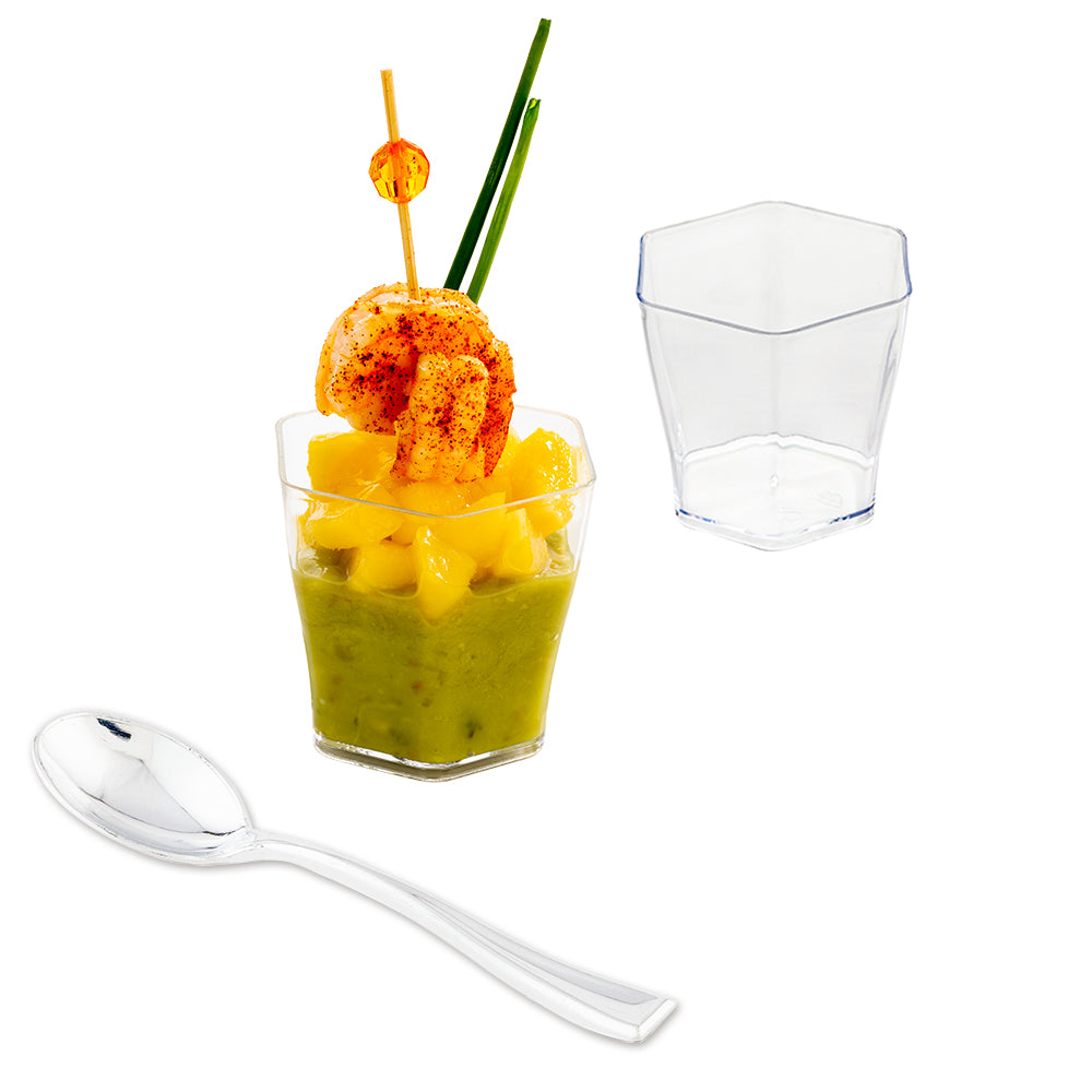 Elevate your event's presentation with our Bundle: Mini Serve 100 2-ounce Hexagon Clear Plastic Glasses with 100 Silver Plastic 4-inch Mini Spoons. This bundle includes durable PS plastic hexagon glasses with a clear finish that enhances the visual appeal of your savory or sweet dishes, making them perfect for upscale mousse glasses or dessert servings. The unique hexagon shape of these plastic plates ensures lasting sturdiness, while the disposable design simplifies post-event cleaning. Complementing these glasses are silver plastic mini spoons with a shiny finish, designed to effortlessly enhance the presentation of your tantalizing dishes. These 4-inch spoons are the ideal size for accompanying miniature tuna tartare or personal-sized strawberry shortcakes, with sturdy handles that can withstand hefty bites of polenta and big scoops of gelato. Made from premium plastic, these appetizer spoons are conveniently disposable, making the post-event cleanup easy. The glasses have a capacity of 2 ounces and compact dimensions of 1.75 inches in length by 1.75 inches in width by 1.75 inches in height, while the spoons measure 4 inches in length. Each order includes 100 plastic glasses and 100 silver plastic mini spoons.