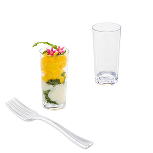 Serve up miniature treats and cocktails in style with our Mini Serve 2-ounce Round Clear Plastic Cannello Shot Glasses with Silver Plastic Mini Forks. These shot glasses are crafted from high-quality plastic and provide a sophisticated way to present delectable bite-sized appetizers, desserts, and craft cocktails to your guests, while the shiny silver finish of these tasting forks will elevate your table presentation. With a capacity of 2 ounces, these dessert shooters are ideal for tapas and amuse bouches, while the sturdy 4-inch forks can stand up to hearty bites of polenta and scoops of gelato. These plastic glasses have a clear display to expertly showcase chocolate mousse layered with bourbon cherries or a deconstructed tiramisu with espresso cream and cocoa, creating an unforgettable dessert display. Conveniently disposable, these clear glasses and cake forks ensure effortless cleanup after any event. These clear glasses measure 1.5 inches in diameter by 3 inches in height and can hold up to 2 ounces, while the plastic forks measure 4 inches in length. Each order includes 100 glasses and 100 forks.
