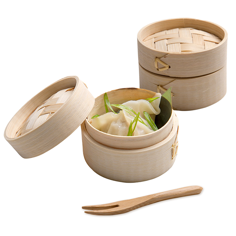 Serve juicy dumplings with our Bambuddha 2-ounce Round Natural Bamboo Mini Steamers with Natural Bamboo Mini Forks. Constructed from organic bamboo, these dim-sum steamers are naturally durable, sturdy, and won’t break while using. These bamboo steam baskets have fitted top and bottom slats that keep mini servings hot and ready. The two long tines of these bamboo forks are perfect for skewering and serving meatballs, fruits, or cheeses without causing splinters. Holding up to 2 ounces, these individual bamboo steamers have precise portioning, making them ideal for serving delectable bite-sized hot or cold treats. These personal bamboo steamers and cocktail forks are biodegradable and commercially compostable, providing an eco-friendly disposal. The natural bamboo finish of these mini single-tier steamers and single-use tasting forks brings a rustic, Asian-inspired style to any tablescape. These bamboo cooking steamers measure 3.25 inches in diameter by 2 inches in height and have a capacity of 2 ounces, while the appetizer forks measure 3.5 inches in length. Each order includes 100 steamers and 100 forks. These items will only degrade outside of the traditional solid waste stream.