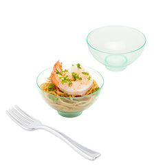 Impress your guests with an elegant tablescape using our Mini Serve 2-ounce Round Seagreen Plastic Coppa Bowls with Silver Plastic Mini Forks. These appetizer bowls and cake forks are made from premium plastic, making them conveniently disposable for an easy cleanup. Featuring an eye-catching translucent seagreen finish and sophisticated raised base, these dessert bowls are perfect for stylishly serving miniature treats at weddings, cocktail parties, and catered events. These plastic bowls are built to securely contain 2 ounces and are perfect for single servings of flavor-packed hors d'oeuvres like individually poached shrimp with herbed garlic aioli or one-bite portions of sauteed rice noodles with crunchy bean sprouts. Paired with the shiny silver 4-inch forks, these seagreen bowls elevate your table setting with an aesthetic touch. The sturdy handles of these dinner forks are ideal for scooping hefty bites of polenta and big scoops of gelato. These round bowls measure 2.5 inches diameter by 1 inch in height and have a capacity of 2 ounces, while the plastic forks measure 4 inches in length. Each order includes 100 bowls and 100 forks.