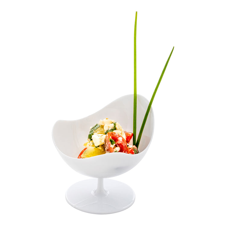 Elevate your appetizer presentation with our Bundle: Mini Serve 100 2-ounce Round White Plastic Ball Chairs with 100 Silver Plastic 4-inch Mini Spoons, offering a stylish and convenient solution for serving bite-sized delicacies. This bundle includes round white plastic ball chairs and silver plastic mini spoons, designed to complement each other seamlessly. The distinctive open-top structure and heightened pedestal base of these plastic cups instantly add a charming touch to your served food. These appetizer cups have a white finish and instantly add a contemporary chic vibe to your fare. With a shiny silver finish, these plastic spoons effortlessly enhance the presentation of your tantalizing dishes. These 4-inch spoons have sturdy handles and can withstand hefty bites of polenta and big scoops of gelato. Designed for convenience, these disposable cups and spoons can be discarded after use for an easy cleanup. These white plastic cups measure 2.75 inches in diameter by 2.75 inches in height and securely hold 2 ounces. Each order includes 100 cups and 100 spoons