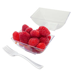 Elegantly serve delectable bites at your next catered event with our Mini Serve 3-ounce Rectangle Clear Plastic Small Architetto Bowls with Silver Plastic Mini Forks. Made from high-quality plastic, these candy bowls and cake forks are disposable, guaranteeing an easy post-event cleanup. These dessert bowls feature a crystal clear finish and modern rectangle design, stylishly displaying miniature appetizers, desserts, and snacks, while the shiny silver 4-inch forks effortlessly enhance your tantalizing dishes. Holding up to 3 ounces, these rectangle bowls are perfect for showcasing single portions of mixed berry yogurt parfaits or chocolate-coated almonds. Each dessert fork has sturdy handles built to withstand hearty portions of polenta and gelato. These clear bowls measure 3.25 inches long by 2.25 inches wide by 1.25 inches tall and have a capacity of 3 ounces, while the included plastic forks measure 4 inches long. Each order includes 100 bowls and 100 forks.