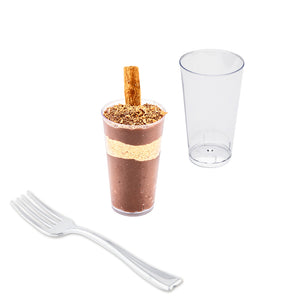 Give your desserts a stylish presentation with our Mini Serve 3-ounce Round Clear Plastic Cannello Dessert Glasses with Silver Plastic Mini Forks. Featuring a premium plastic construction, these appetizer cups and tasting forks are durable and sturdy, allowing you to serve sauces and custards worry-free. These mousse cups have a clear finish that showcases your colorful parfaits and layered cheesecakes with an elegant. The round shape and tapered sides of these parfait cups provide an ideal canvas for your cafe’s edible masterpieces while giving guests an effortless grip. These food cups are accompanied by appetizer forks featuring a shiny silver finish that complements all tablescapes. Pair these clear cups with the included sturdy 4-inch forks that make scooping bites of gelato and shortcake a breeze. These clear plastic cups and cake forks are disposable to shorten your cleanup time. Measuring 1.75 inches in diameter by 3.25 inches in height, these dessert cups have a capacity of 3 ounces, while the plastic forks measure 4 inches in length. Each order includes 100 glasses and 100 forks.