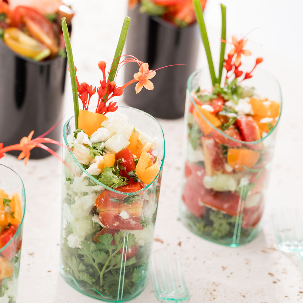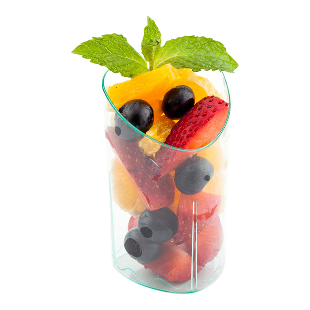 Present fares with flair with our Mini Serve 3-ounce Seagreen Plastic Triangolo Shot Glasses with Silver Plastic Mini Forks. Crafted from high-quality plastic, these appetizer cups feature an elegant convexed triangular rim with a tinted-seagreen finish that instantly adds style to your food presentation. These shot glasses can hold up to 3 ounces and are ideal for serving miniature portions of gelato, sorbet, or other chilled treats. The shiny silver finish of these plastic forks effortlessly enhances your table setting and allows guests to enjoy bites of their favorite desserts. These 4-inch forks have strong, sturdy handles that can withstand substantial scoops of delicious dishes without bending or breaking. To shorten your cleanup time, these dessert cups and tasting forks are disposable. These plastic shot glasses measure 1.75 inches long by 1.75 inches wide by 3 inches tall and have a capacity of 3 ounces, while the mini forks measure 4 inches long. Each order includes 100 glasses and 100 forks.