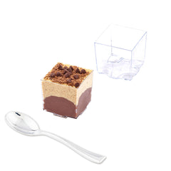 Serve desserts and canapés with our Bundle: Mini Serve 100 3-ounce Square Clear Plastic Quadrato Cups with 100 Silver Plastic 4-inch Mini Spoons. This bundle includes durable clear plastic cups with smooth rims for a comfortable eating experience and shiny silver plastic spoons designed to enhance the presentation of your tantalizing dishes. The square and stackable design of these quadrato cups is space-efficient, making them ideal for large social gatherings, while the clear look adds an elegant visual charm. These 3-ounce cups are perfect for serving bite-sized appetizers, desserts, or drinks, and their disposable design ensures a simple and efficient cleanup process. These 4-inch silver plastic spoons feature strong and sturdy handles, capable of handling hefty bites and big scoops, making them ideal for accompanying miniature dishes like tuna tartare or personal-sized strawberry shortcakes. Each cup measures 1.75 inches in length by 1.75 inches in width by 1.5 inches in height, while these spoons measure 4 inches in length, providing the perfect size for small servings. Each order includes 100 plastic cups and 100 plastic spoons.