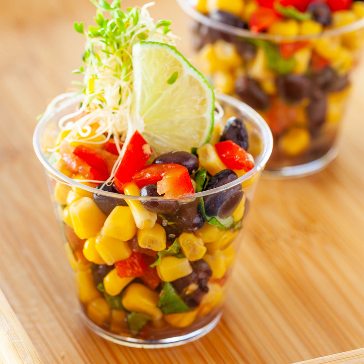 Elevate your dessert presentation with our Bundle: Mini Serve 100 4-ounce Round Clear Plastic Arco Dessert Cups with 100 Silver Plastic 4-inch Mini Spoons, offering a stylish and convenient solution for serving individual treats. This bundle includes transparent plastic dessert cups that showcase the vibrant colors and fresh ingredients of your delectable creations, attracting customers' attention. Crafted from durable plastic, these appetizer cups and spoons do not crack or warp easily. The classic round design of these plastic cups provides a comfortable hold, avoiding accidental spills at your bakery, restaurant, or catered event. With a shiny silver finish, these plastic spoons are designed to effortlessly enhance the presentation of your tantalizing dishes. These 4-inch spoons are the ideal size for accompanying miniature tuna tartare, personal-sized strawberry shortcakes. With sturdy handles, these mini spoons are ideal for scooping up hefty bites of polenta and gelato. For an easy cleanup, these disposable cups and spoons can be discarded after use. These dessert cups measure 2.5 inches in diameter by 2.25 inches in height and can hold up to 4 ounces. Each order includes 100 cups and 100 spoons.