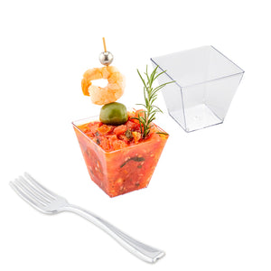 100 4 OZ SQUARE CLEAR PLASTIC SMALL KOVA CUPS AND 100 MINI FORKS