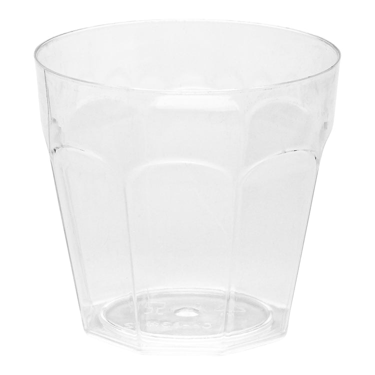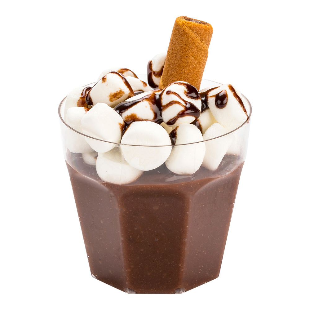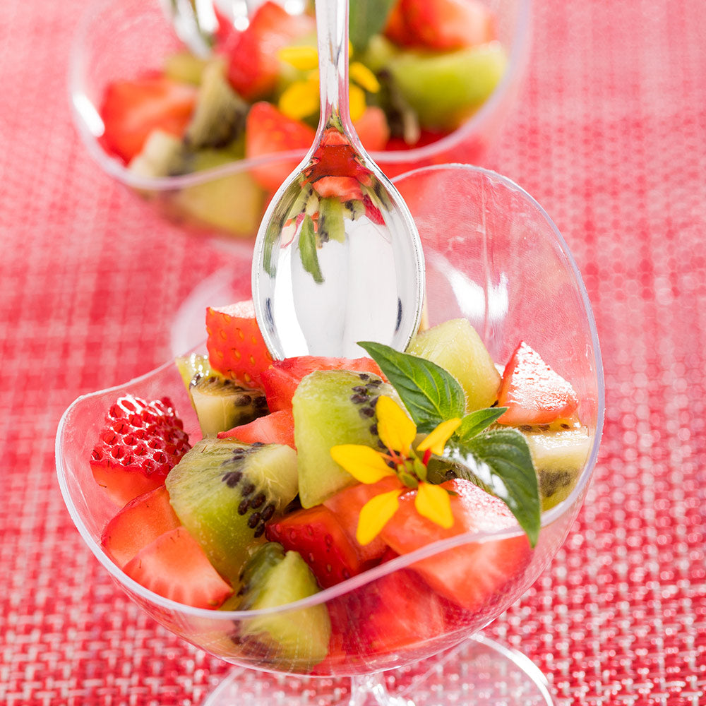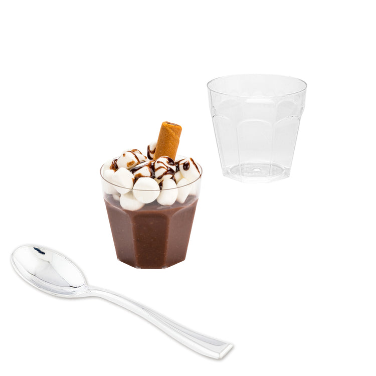 Elevate your dessert and appetizer presentations with our Bundle: Mini Serve 100 5-ounce Round Clear Plastic Mini Pilsner Cups with 100 Silver Plastic 4-inch Mini Spoons. This bundle includes charming straight-paneled clear plastic mini cups and stylish silver plastic mini spoons, designed to effortlessly enhance the decor at any venue. Made from durable plastic, these appetizer cups and spoons do not crack or warp easily. These dessert cups have a clear finish and beautifully present scrumptious s'mores in a cup at your dessert buffet or stylishly serve delectable tiramisu. The shiny silver finish of these plastic spoons complements the tantalizing dishes. These 4-inch spoons have sturdy handles and can withstand hefty bites of polenta, or big scoops of gelato. Ideal for easy cleanup, these disposable cups and spoons can be discarded after use for an efficient cleanup. These 5-ounce cups measure 2.75 inches in diameter by 2.5 inches in height. Each order includes 100 cups and 100 spoons.
