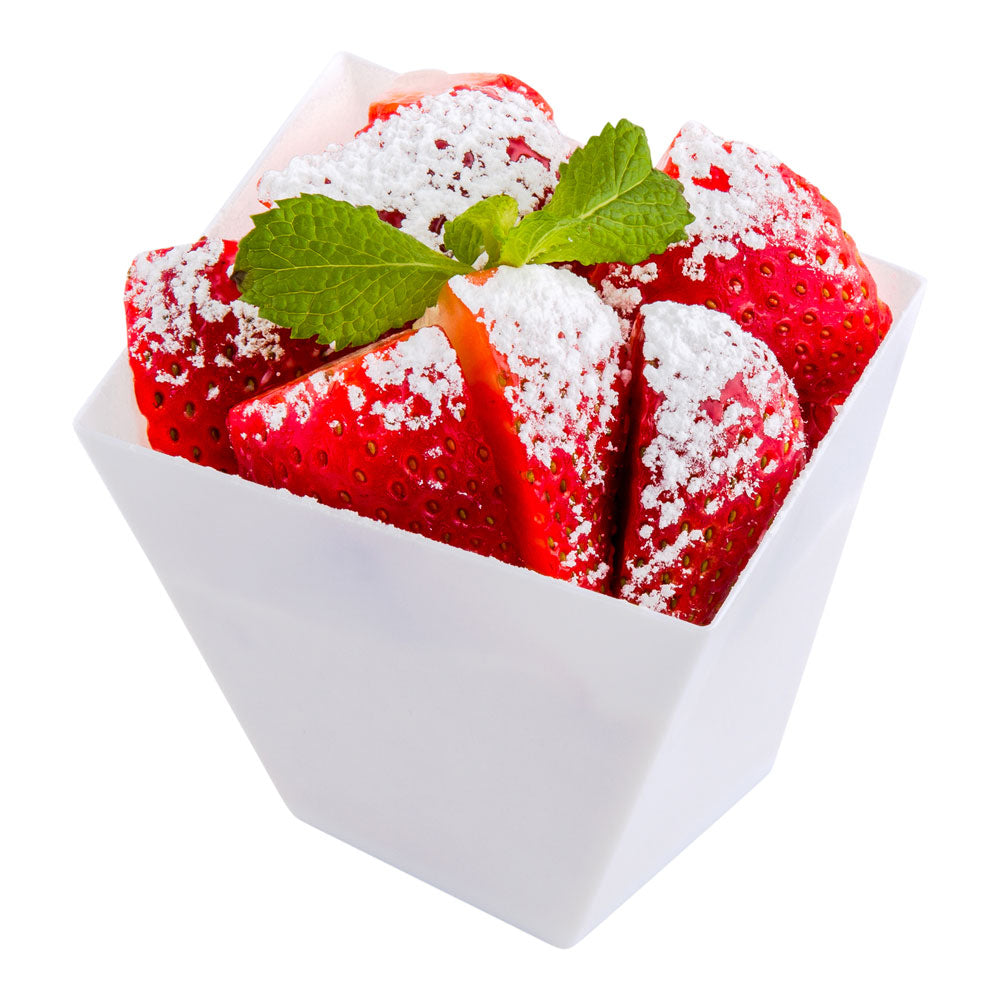 Serve food in style with our Mini Serve 6-ounce Square White Plastic Large Girata Dishes with Silver Plastic Mini Forks. Constructed from premium plastic, these geometric-inspired square white cups feature a sleek twisted shape and widened opening to elegantly display your delectable hors d'oeuvres and miniature desserts. These silver plastic forks have sturdy handles that effortlessly enhance the presentation of your tantalizing dishes while standing up to hearty bites. Holding up to 6 ounces, these square dishes are perfect for serving single portions of various cold food items. Conveniently disposable, these serving dishes and appetizer forks are a perfect stylish flatware option for events and venues looking for a hassle-free cleanup. These food cups measure 3.25 inches in length by 2.75 inches in width by 3 inches in height and have a capacity of 6 ounces, while the included plastic forks measure 4 inches in length. Each order includes 100 dishes and 100 forks.