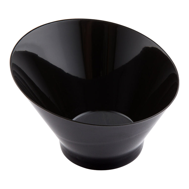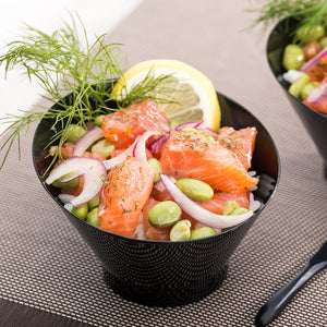 Elevate your culinary presentations with our Bundle: Mini Serve 100 7-ounce Round Black Plastic Incline Bowls with 100 Silver Plastic 4-inch Mini Spoons. This bundle includes 100 black plastic incline bowls and 100 silver plastic mini spoons, allowing you to create visually stunning dining experiences. Made from premium plastic, these serving bowls and spoons are durable and do not break or warp easily, ideal for serving food at busy restaurants. The sloping edge of these food bowls adds an artistic flair to your presentations, perfect for serving soups, stews, desserts, and other culinary delights. Featuring a sleek black finish, these plastic serving bowls exude sophistication and modern elegance. The shiny silver finish of these plastic spoons offers a refined, upscale appearance for both casual and formal occasions. With a sturdy handle, these disposable spoons can hold up hefty bites of polenta and big scoops of gelato. Measuring 4.25 inches in diameter by 2.75 inches in height, these black plastic bowls can hold up to 7 ounces. Each order includes 100 bowls and 100 spoons.