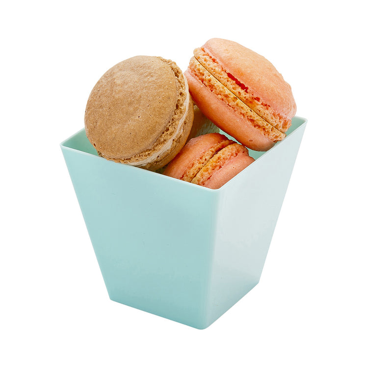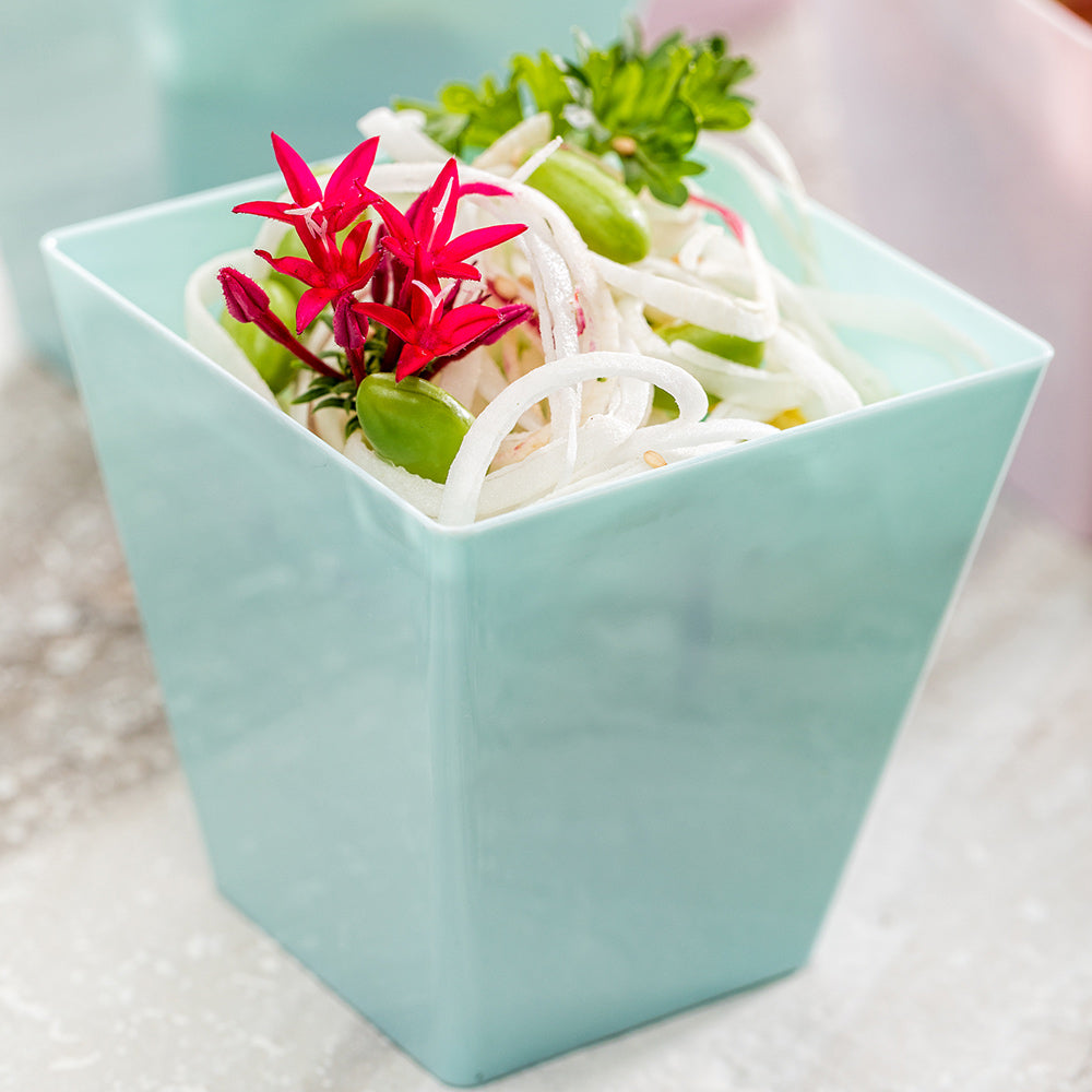 Add an elegant touch to your catering presentations with Mini Serve 8-ounce Square Baby Blue Plastic Large Kova Cups with Silver Plastic Mini Forks. Crafted from premium plastic, these parfait cups and tasting forks are conveniently disposable, making them an excellent option for providing easy cleanup to trendy bakeries and upscale catering companies. These dessert cups have a capacity of 8 ounces and generously hold a variety of bite-sized snacks. Featuring a contemporary square shape and baby blue finish, these pudding cups are designed to stylishly serve and enhance bite-sized snacks and sweets while the silver finish of the cake forks lends a charming, elegant touch. These disposable cups have tapered to add a sleek look while offering a comfortable grip, and the mini forks feature sturdy handles to easily scoop up hearty bites. Pair these baby blue dessert cups with lids (SKU: RWP0049C) to take your food on the go. These square cups measure 2.75 inches long by 2.75 inches wide by 2.75 inches tall and have a capacity of 8 ounces, while the included plastic forks measure 4 inches long. Each order includes 100 cups and 100 forks. Lids are available and sold separately.