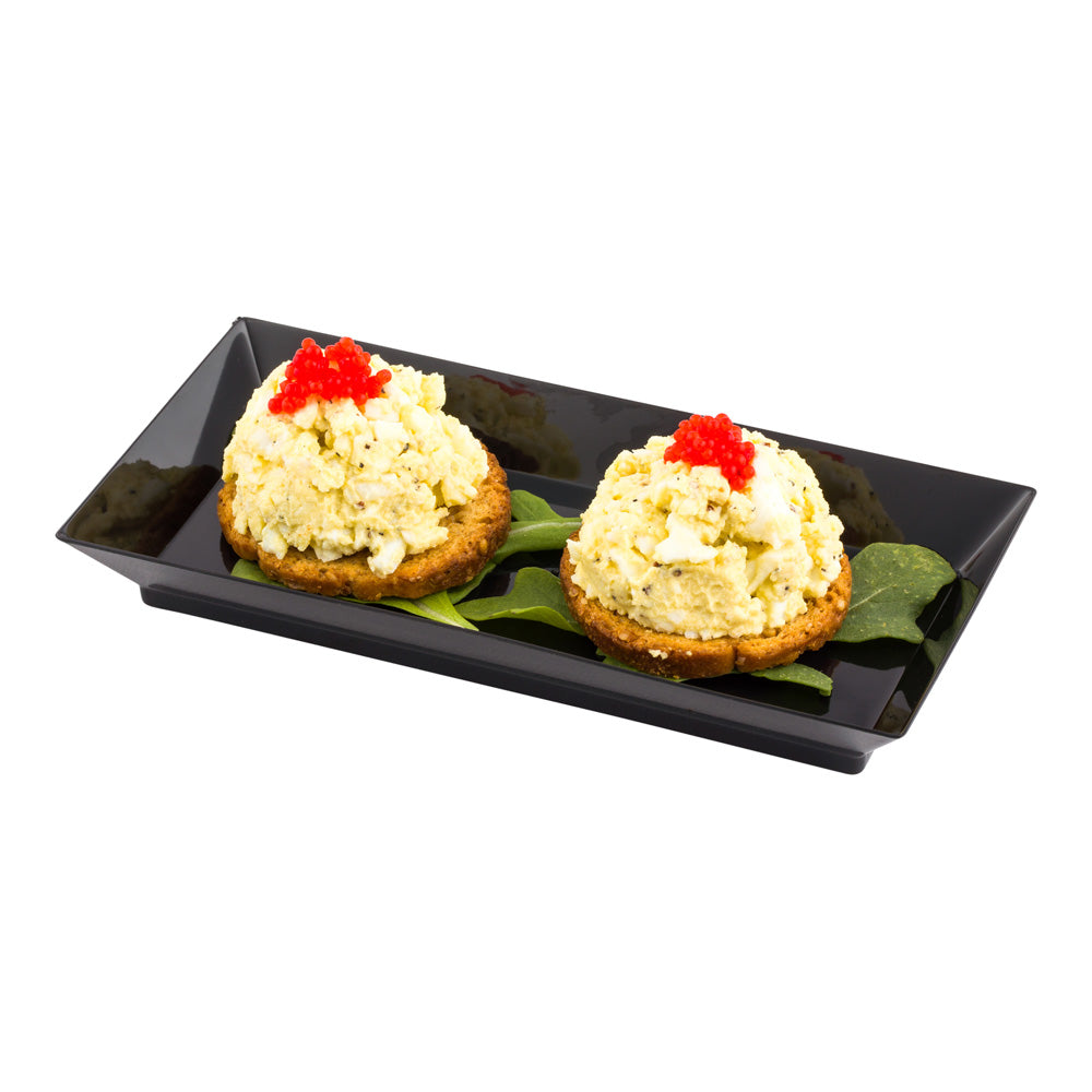 Elevate your appetizer presentation with our Bundle: Mini Serve 100 Rectangle Black 5-inch Plastic Plates with 100 Silver Plastic 4-inch Mini Spoons. This bundle includes a premium collection of disposable black rectangular plastic plates and shiny silver plastic mini spoons, perfect for enhancing the visual appeal of your culinary creations. The sturdy plastic plates feature raised edges, securely containing your delectable offerings while their sleek black finish and rectangular design lend a touch of sophistication to any plating. These 4-inch silver plastic spoons effortlessly complement the plates, their shiny finish designed to accentuate the presentation of your tantalizing dishes, from miniature tuna tartare to personal-sized strawberry shortcakes. Built with strong and sturdy handles, these spoons can handle hefty bites of polenta and big scoops of gelato with ease. The 5 inches in length by 2.5 inches in width plates and 4-inch spoons provide the perfect canvas for your culinary artistry. Each order includes 100 plastic plates and 100 mini spoons.