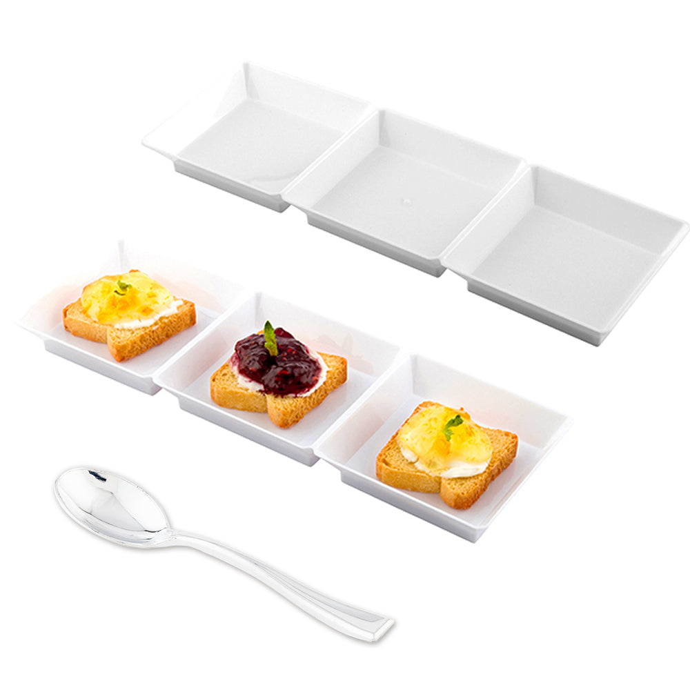 Elevate your next event with our Bundle: Mini Serve 100 Rectangle White 7.5-inch Plastic Terzetto Mini Plates with 100 Silver Plastic 4-inch Mini Spoons. This bundle includes our mini plates and mini spoons, perfectly complementing each other. Crafted from superior PS plastic, the sturdy mini plates accommodate a variety of foods without warping or damage, ensuring a stylishly prepared dish with their three defined compartments that allow diverse dishes to be served simultaneously. The crisp white shade of these terzetto mini plates adds a touch of minimalist elegance that complements any dining decor, while the disposable design provides an easy clean-up solution. Featuring a shiny silver finish, our mini spoons effortlessly enhance the presentation of your tantalizing dishes, with their 4-inch length being the ideal size to accompany miniature tuna tartare or personal-sized strawberry shortcakes. The strong and sturdy handles of these spoons stand up to hefty bites of polenta and big scoops of gelato. The plates measure 7.5 inches long by 2.5 inches wide, while the spoons are 4 inches in length, offering ample space for portion-controlled servings of appetizers, desserts, or various meals. Each order includes 100 plastic plates and 100 mini spoons.