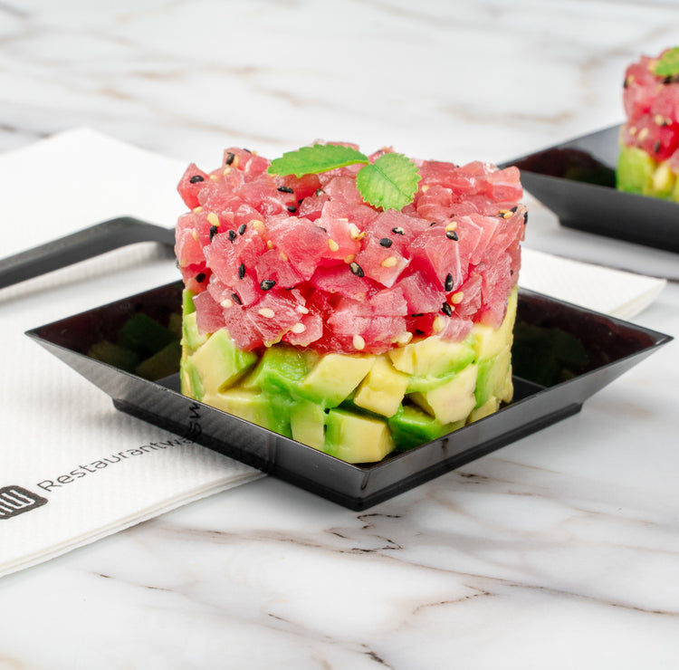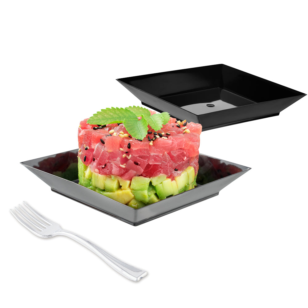 Artfully plate and serve unique appetizers with style using our Mini Serve Square Black Plastic Small Modern Plates with Silver Plastic Mini Forks. Crafted from high-quality PS plastic, these square plates and cake forks are effortlessly disposable, making them the perfect option for catering events, banquets, or restaurants as they provide a quick cleanup. Featuring a glossy black finish and squared design, these serving plates add visual appeal to small servings, while their raised edges provide mess-free serving and handling. With sturdy handles, these plastic forks are ideal for enjoying hearty scoops without compromising their integrity. These black plastic plates measure 4 inches in length by 4 inches in width by 0.5 inches in height, while the silver plastic forks measure 4 inches in length. Each order includes 100 plates and 100 forks.