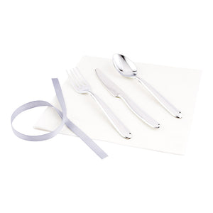 - Cutlery sets include a fork, spoon, knife, and napkin tied together with a silver ribbon for easy setup and added sophistication