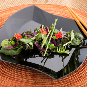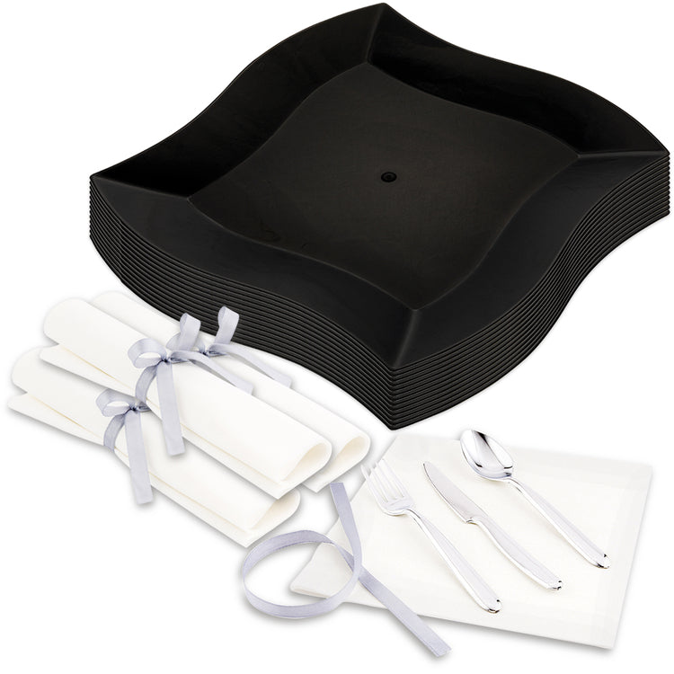 Host with ease using our Bundle: Maxi Serve Square Black Plastic Large Aqua Plates with Moderna Silver Plastic Cutlery Sets, providing a stylish and convenient solution for all your culinary needs. This bundle includes 100 elegant sturdy disposable plates and 100 sleek silver plastic cutlery sets that are tied with an elegant ribbon. The curvy rim of the plates adds a stylish touch to tableware settings, creating an attractive upscale food presentation perfect for gourmet entrees like steak, chicken, and fish. The raised edges of these premium plastic plates make them ideal for containing noodles and sauce without any spill-offs, making them the perfect pasta dishes. These chic black square plates accommodate traditional dishes in a modern way, while the plastic cutlery sets, featuring a spoon, fork, knife, and napkin, provide a convenient solution for serving any dish. Built from premium plastic, these disposable cutlery sets are wrapped in napkins, allowing customers to enjoy meals without messes. The 9-inch square plates are ideal for serving entrees and side dishes. Each order includes 100 plastic plates and 100 cutlery sets.
