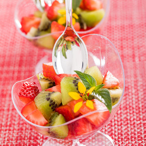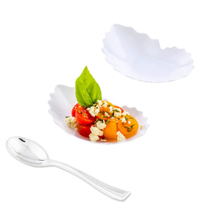 Impress guests with our Bundle: Mini Serve 100 White Plastic 3.25-inch Mini Coquille Plates with 100 Silver Plastic 4-inch Mini Spoons, offering an elegant yet practical solution for serving appetizers and small bites. This bundle includes the scalloped white plastic plates and the shiny silver plastic spoons, perfectly complementing each other for a cohesive and stylish tablescape. The unique seashell design of these white plates, coupled with their elegant finish, adds a touch of luxury to your event, while their disposable nature ensures efficient after-party cleanup. These durable plastic appetizer plates are ideal for stylishly serving cold foods like grilled oysters or beautifully presenting lemon macarons. Complementing the plates are the silver plastic spoons, designed to effortlessly enhance the presentation of your tantalizing dishes with their shiny finish. The 4-inch spoons are the perfect size for accompanying miniature tuna tartare or personal-sized strawberry shortcakes, with sturdy handles that can handle hefty bites of polenta or big scoops of gelato. Made from premium plastic, these spoons are conveniently disposable and recyclable, making them an eco-friendly choice for cafes. These plates measure 3.25 inches in diameter, while the spoons are 4 inches long, accommodating a variety of small appetizers, desserts, or hors d'oeuvres. Each order includes 100 plastic plates and 100 mini spoons.