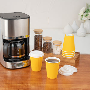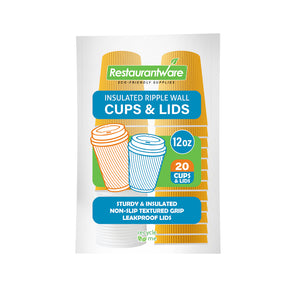 Ensure secure beverage service with spill-resistant coffee cups with lids. Restpresso 12 oz Yellow Paper Ripple Wall Coffee Cups with Lids boast a ripple wall design that effectively insulates 12-ounce hot beverages while keeping hands cool. The 90-millimeter diameter white lids fit snugly, preventing spills and keeping coffee hotter for longer, making these disposable coffee cups ideal for busy coffee shops and cafes. The vibrant yellow color adds a lively touch to any setting, enhancing the visual appeal of your service. Constructed from durable paper, these insulated ripple cups provide a sturdy non-slip grip, reducing the risk of accidents during transport. The greaseproof lining supports both hot beverages and snacks, maintaining quality and taste whether you're serving coffee or desserts. Elevate your drinkware offerings with these functional and stylish options that simplify cleanup and support sustainability initiatives. Sold in a 20 count box.