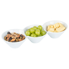 Creatively serve small bites with our Chef 101 Triplets Collection Modern Bowl Set. Designed with 3 connected porcelain bowls, these chic serving dishes showcase sweet and savory treats with style. Constructed from premium porcelain, these durable white serving platters are conveniently microwave and dishwasher-safe. This 18-ounce serving bowl set can be used to elegantly serve salty pretzels, chocolate covered almonds, mixed nuts, and more! These 18-oz food serving bowls measure 13.4 inches long by 4.9 inches wide and ship in a 1 count box.