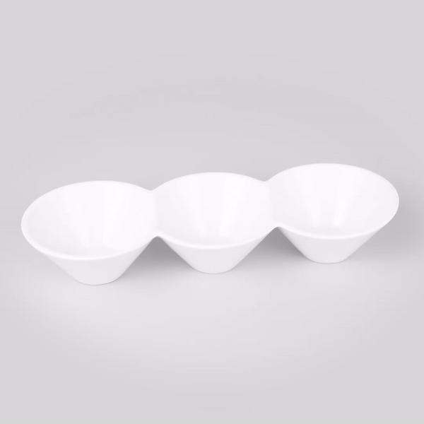 - 3 connected bowls allow for organized presentation of multiple items in single unit