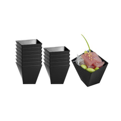 Delight your guests with our Mini Serve 2-ounce Square Black Plastic Girata Dessert Dishes. Fabricated from PS plastic, these black plastic cups assure durability, smoothly catering to various dessert servings. Showcasing a quadrilateral-shaped design, these Girata dessert dishes offer a visual appeal, enhancing the presentation of your delicious offerings. Sporting a lustrous black finish, these appetizer cups add a distinctive touch of elegance to any occasion. Versatile in their uses, these mini dessert cups are perfect for serving a range of mini appetizers to sweet delicacies. These disposable mini dessert dishes grace your event with convenience, simplifying the cleaning process after parties. With a capacity of 2 ounces and dimensions of 2 inches in length by 2 inches in width by 1.75 inches in height, these dessert cups are apt for serving bite-sized treats, sustaining a compact and chic look. Sold in a 100 count box.