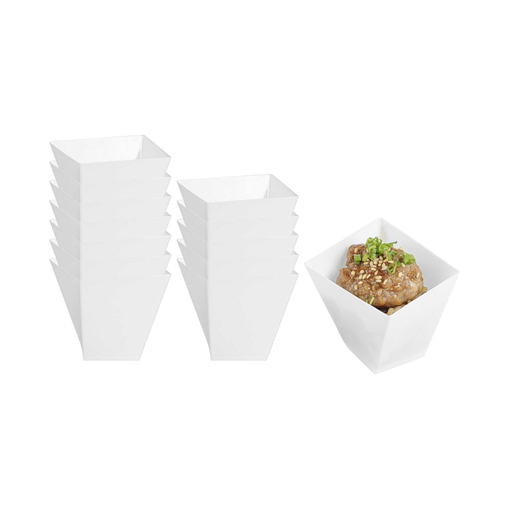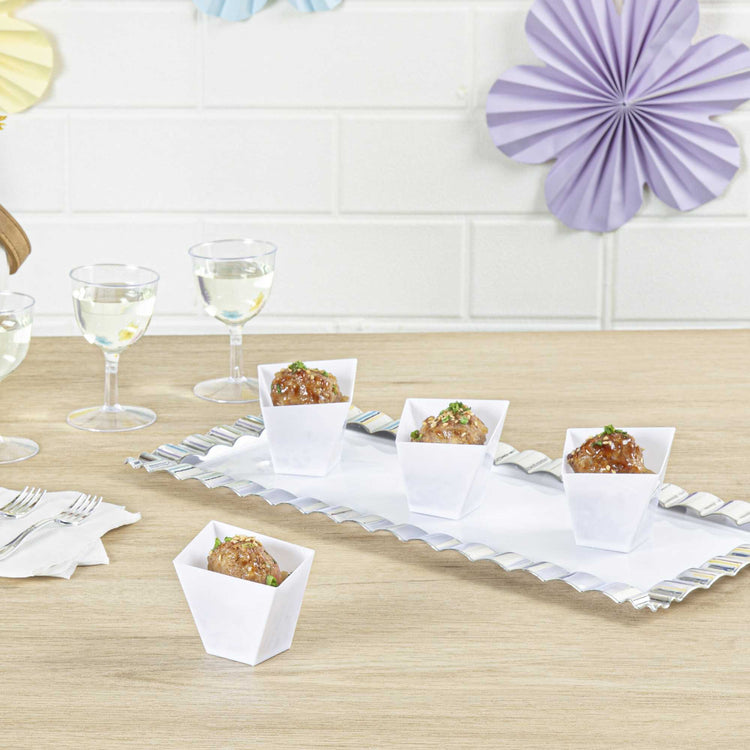 Dazzle your guests with our Mini Serve 2-ounce Square White Plastic Girata Dessert Dishes. Manufactured from PS plastic, these white quadrilateral mini cups provide durability, seamlessly accommodating varied dessert requirements. These Girata dessert dishes exhibit a distinct four-sided design, augmenting the visual appeal of your gourmet preparations. Displaying a pristine white hue, these mini cups inject a sublime elegance into any setting. Broad in their uses, these dessert cups proficiently serve a myriad of mini appetizers to sweet delicacies. These disposable white cups simplify your event management task, ensuring effortless cleanup post-event. Boasting a capacity of 2 ounces and dimensions of 2 inches in length by 2 inches in width by 1.75 inches in height, these mini cups are aptly sized for serving bite-sized eats while maintaining a stylish and streamlined aesthetic. Sold in a 100 count box.