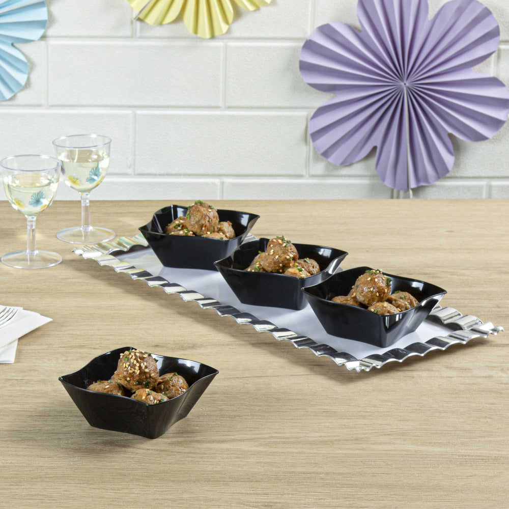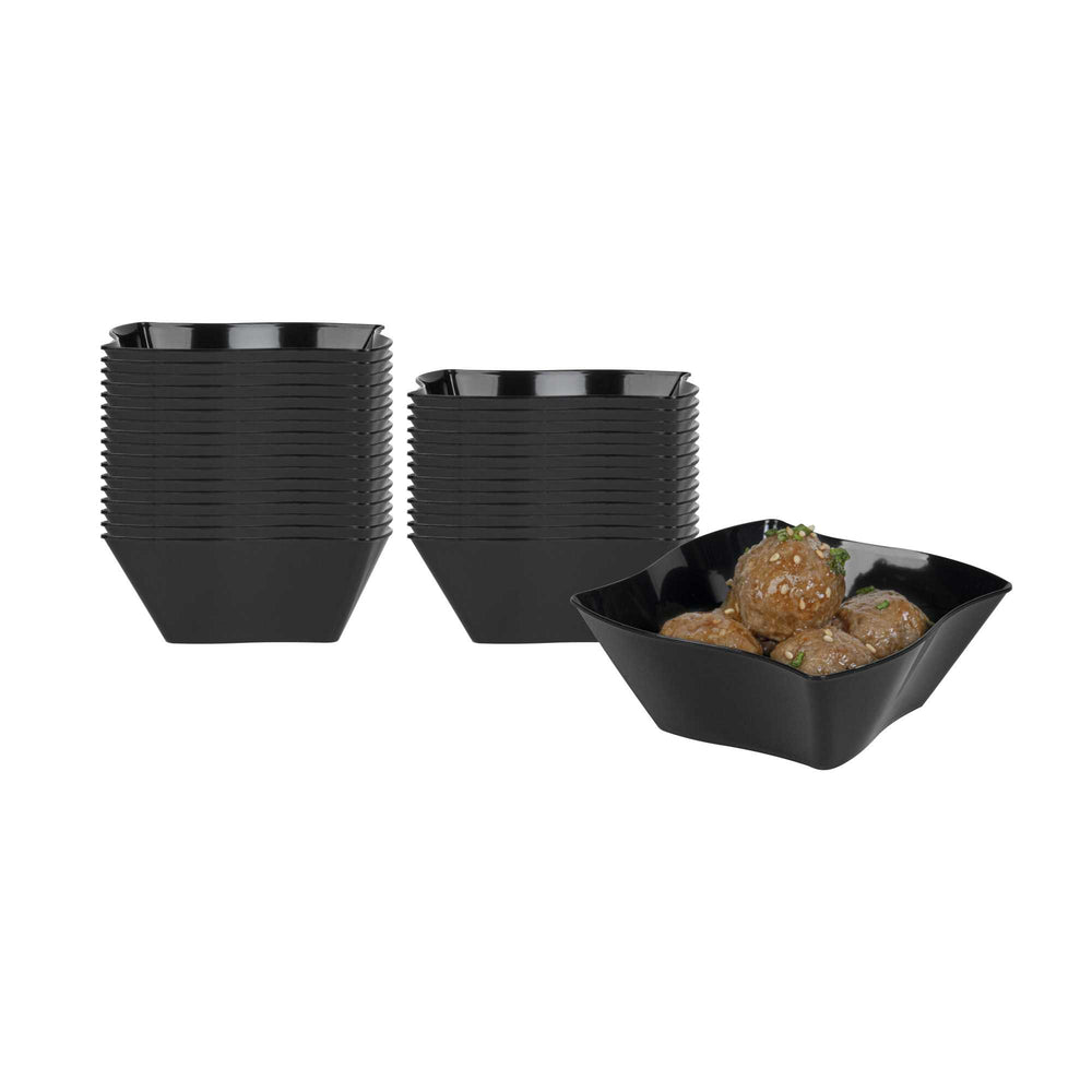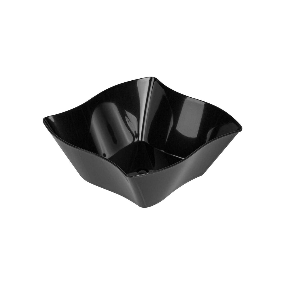 Serve hors d'oeuvres and miniature desserts in style with our Mini Serve 6-ounce Square Black Plastic Aqua Bowls. Featuring a sleek black finish and a contemporary curved design, these small plastic bowls are ideal for buffets, banquets, and other catering events. These modern black bowls feature a strong and sturdy plastic construction that is conveniently disposable. Designed with 1.4-inch raised edges, these mini plastic bowls are an excellent serving solution for saucier appetizers, salads, and desserts. Use these black disposable dessert bowls to serve individual portions of a decadent chocolate tart, or as a mess-free way to serve a garlicky seafood risotto. Each of these plastic bowls can contain up to 6 ounces of your favorite snacks, sides, or sweets and measure 3.25 inches in length by 3.25 inches in width by 1.5 inches in height. Sold in a 100 count box.