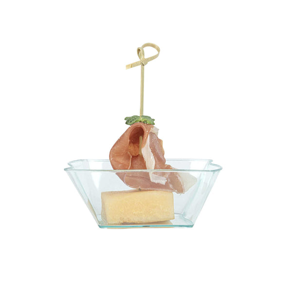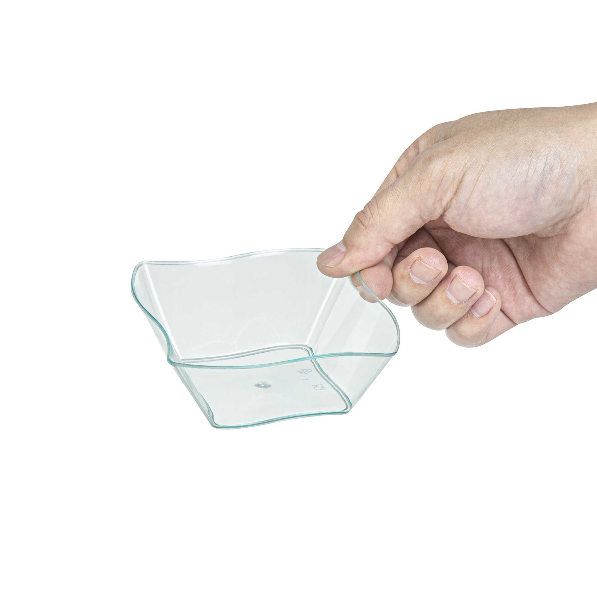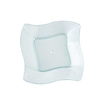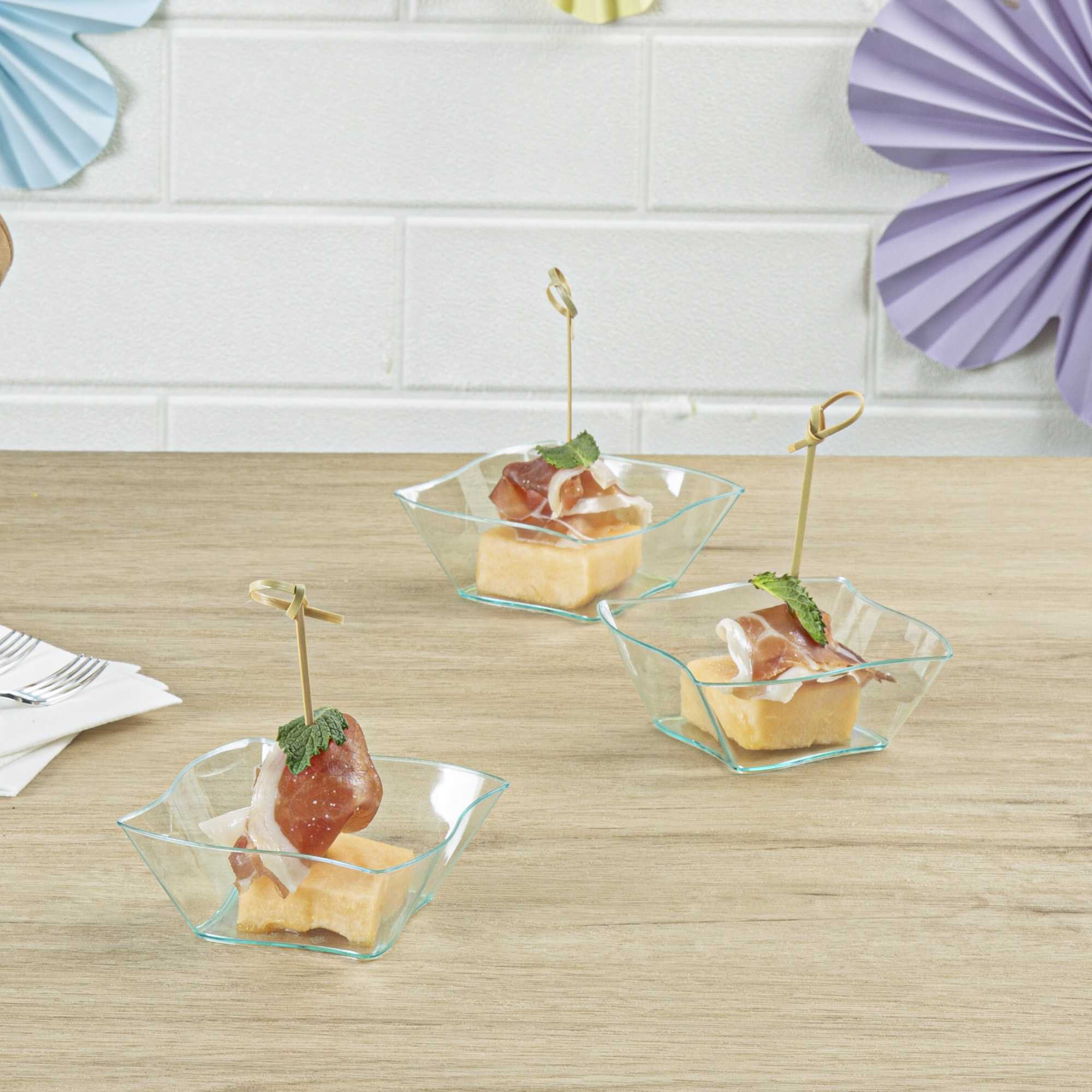 Dazzle your guests with miniature appetizers and hors d'oeuvres in our 6-ounce Square Seagreen Plastic Aqua Bowls. Featuring a unique curved design, these contemporary appetizer cups bring a memorable touch to cocktail parties, banquets, or other catering events. Use these plastic dessert cups as a conveniently portable and mess-free way to serve small portions of creamy polenta and slow-braised short ribs or to stylishly serve miniature chocolate souffles and fruit compotes. With a disposable feature, these plastic bowls make cleaning easy. Designed with a lovely seagreen tint, these small, clear plastic bowls are sure to be a hit at your next event. These 6-ounce plastic bowls measure 3.25 inches in length by 3.25 inches in width by 1.5 inches in height. Sold in a 25 count box.