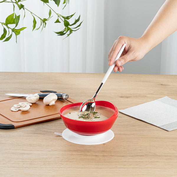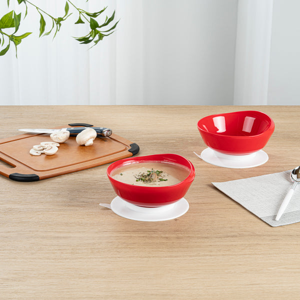 Ensure mealtime success with spill-proof adaptive dining solutions. The Adapt Tek Non-Slip Spill Proof Scoop Bowl features a non-skid suction base that securely holds the bowl in place, effectively reducing spills and facilitating easier scooping for individuals with limited mobility. Its innovative high-to-low contour lip guides food effortlessly onto utensils, making this adaptive dining bowl ideal for seniors and individuals with disabilities who require assistance. Crafted from premium plastic, this bowl is both microwave and dishwasher safe, ensuring easy cleanup and durability in busy foodservice environments. With its bold red color, it enhances visual engagement and stimulates appetite, particularly benefiting individuals with cognitive or vision challenges. Measuring 5.79 inches in diameter and holding up to 18.6 ounces, it is perfect for nursing homes, assisted living facilities, and home care settings. Each order includes 1 Adapt Tek Non-Slip Spill Proof Scoop Bowl.