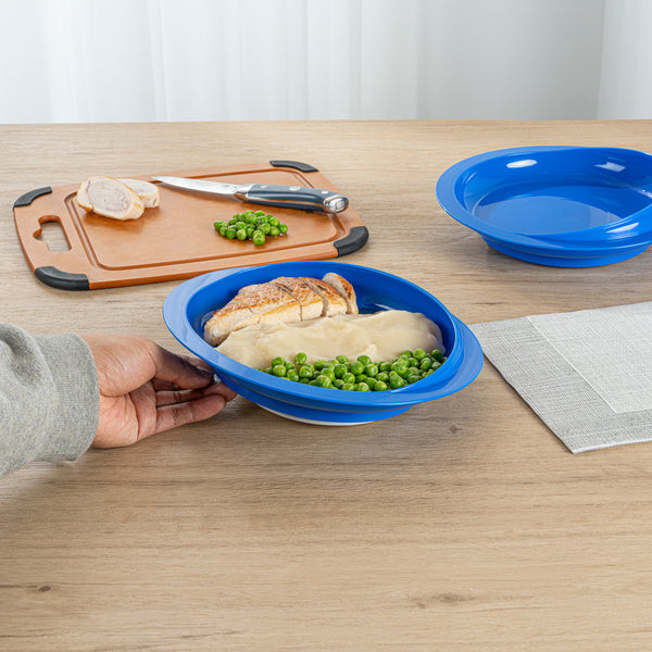 Enhance dining independence with non-slip dinnerware. The Adapt Tek Plastic Adaptive Scoop Plate features an anti-skid rubber suction bottom that prevents spills, ensuring a stable dining experience in healthcare facilities and assisted living centers. Its wide rim contoured lip aids one-handed eating, making it ideal for individuals with limited mobility. The high to low rim offers excellent scooping control, allowing for easier self-feeding, and the plate is designed for both hot and cold foods. Made from durable plastic, this adaptive scoop plate is microwave and dishwasher safe, enhancing operational efficiency by simplifying cleaning and reheating tasks. With a diameter of 9 inches and a height of 2 1/4 inches, this one-handed eating plate is perfect for rehabilitation clinics aiming to support patients regaining motor skills. Choose this user-friendly design to improve mealtime autonomy. Each order includes 1 Adapt Tek Plastic Adaptive Scoop Plate.