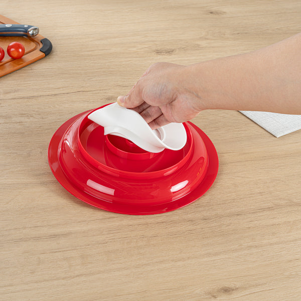 RED PLASTIC SCOOP PLATE - SPILLPROOF, WITH SUCTION BASE