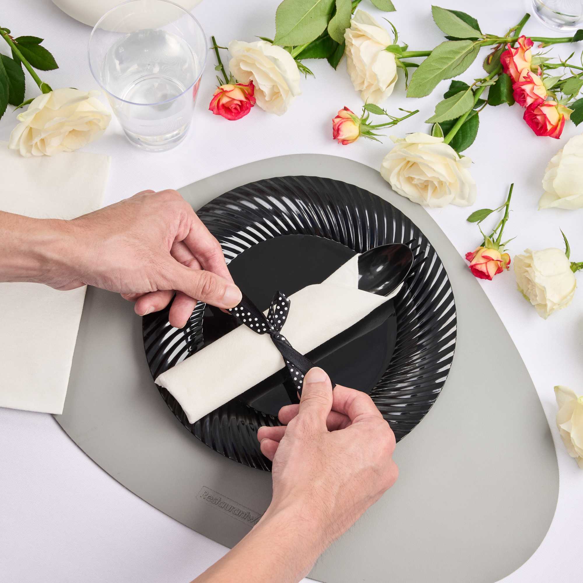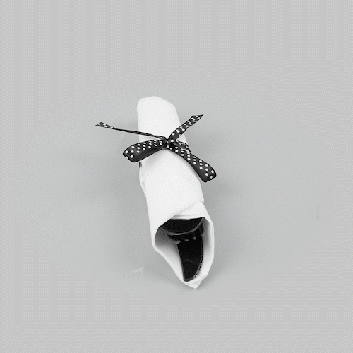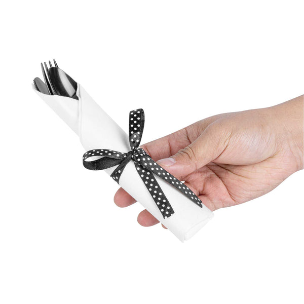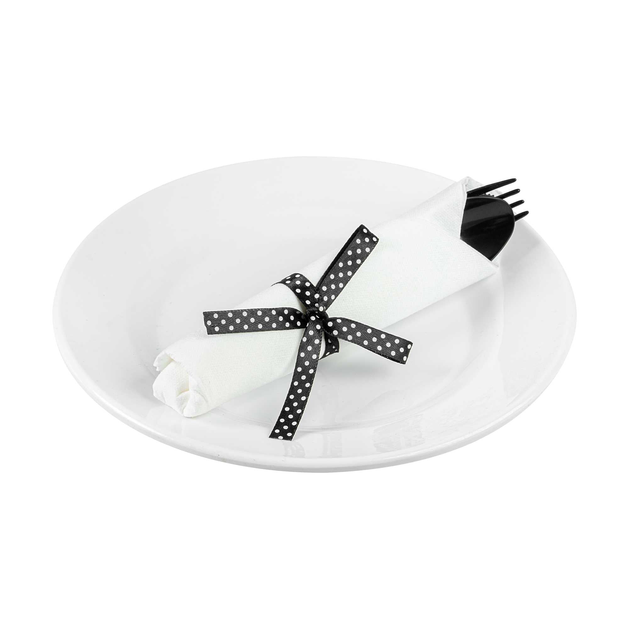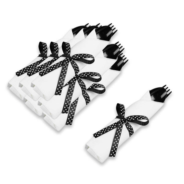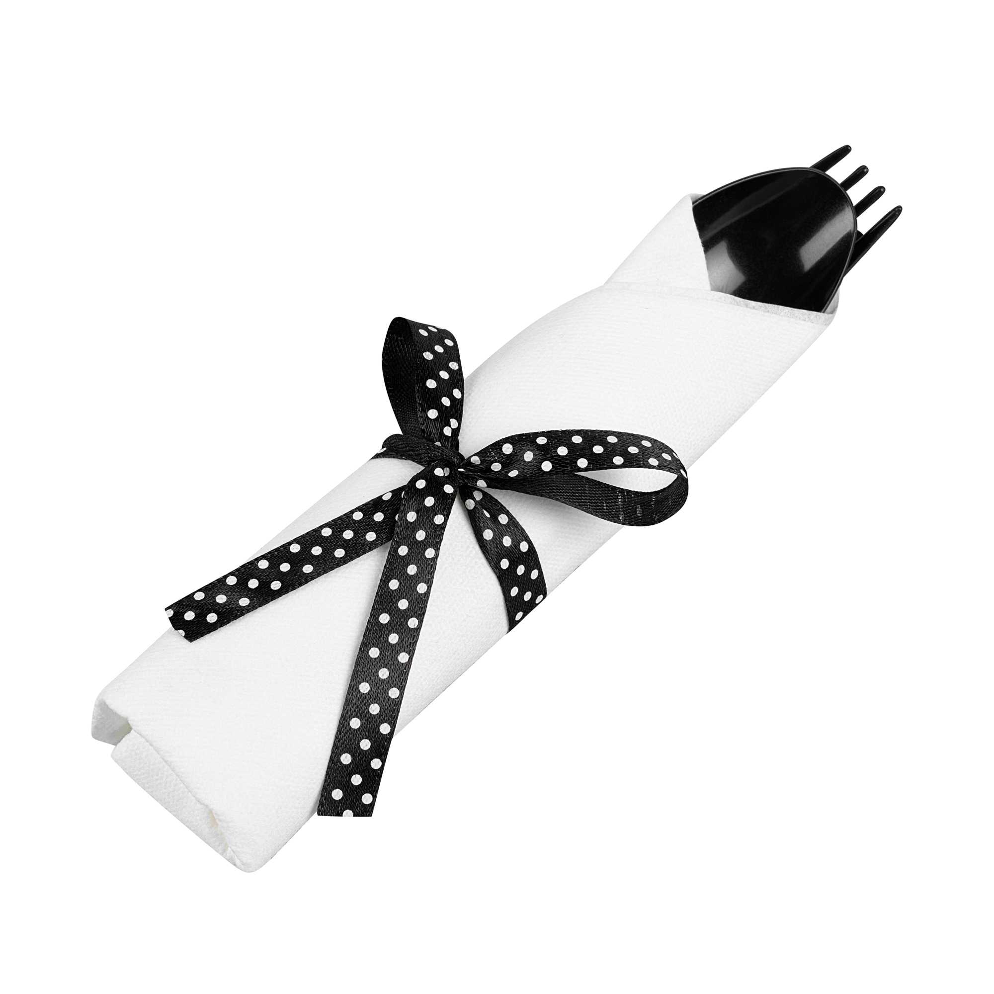 BLACK PLASTIC CUTLERY SET - WITH WHITE NAPKIN, POLKA DOT RIBBON