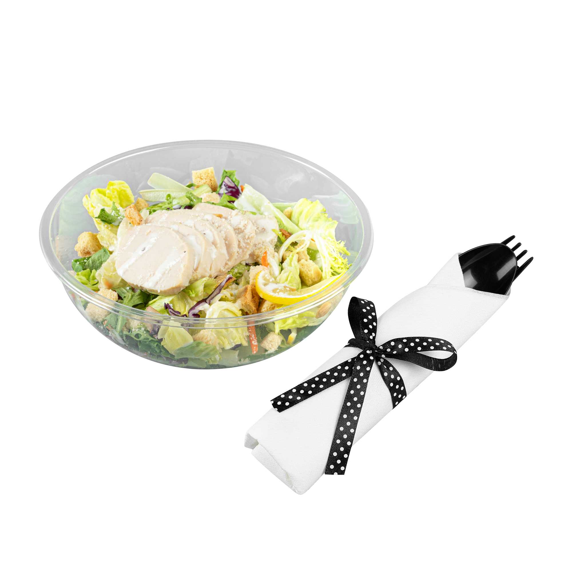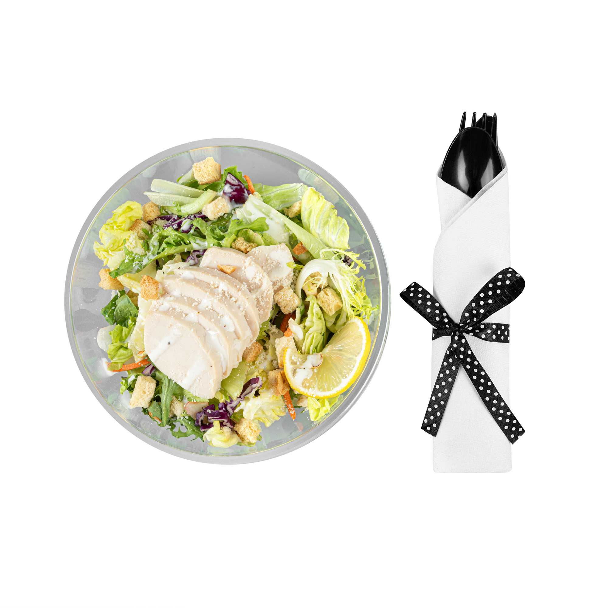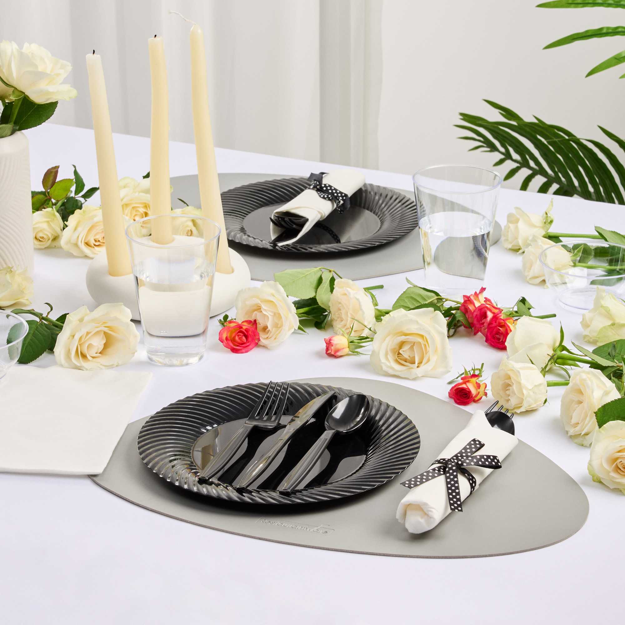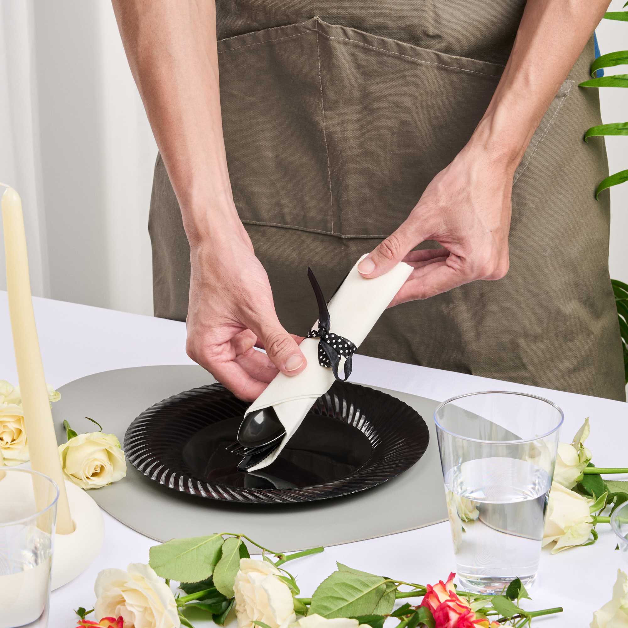BLACK PLASTIC CUTLERY SET - WITH WHITE NAPKIN, POLKA DOT RIBBON