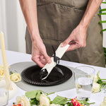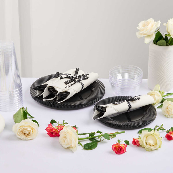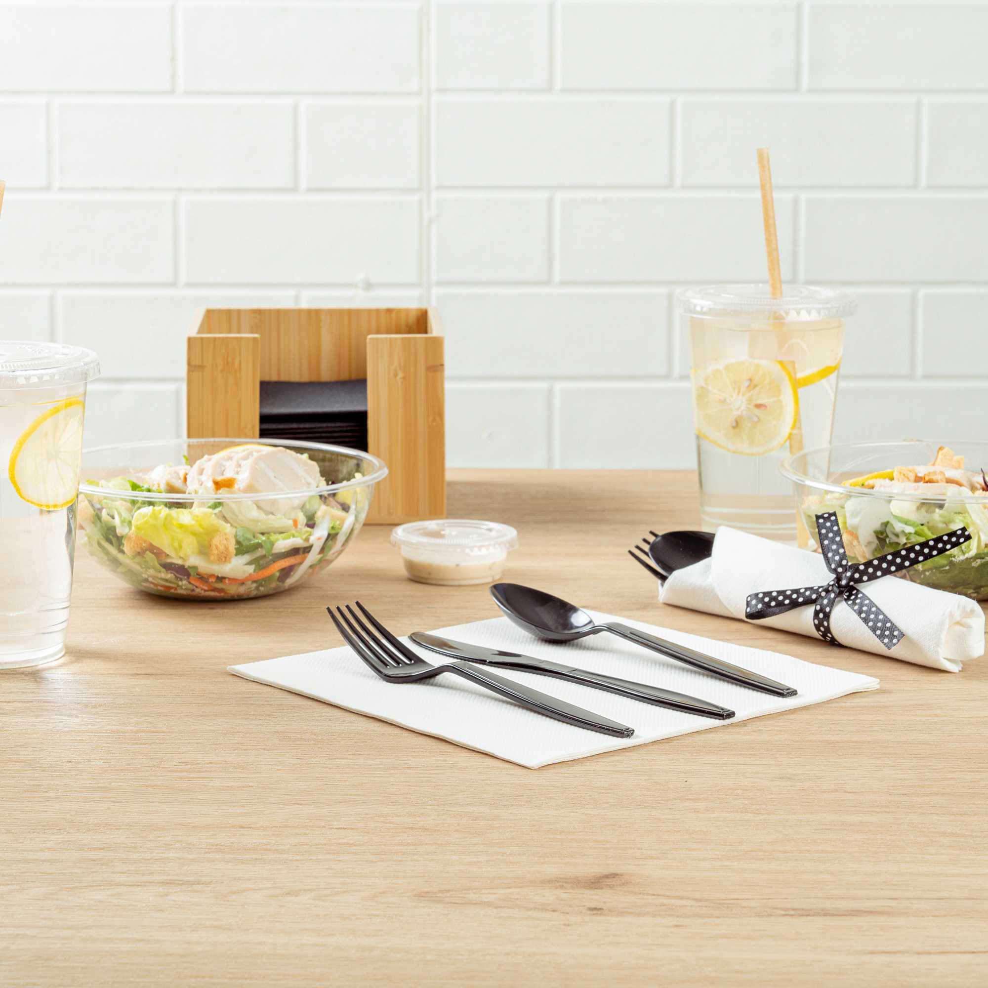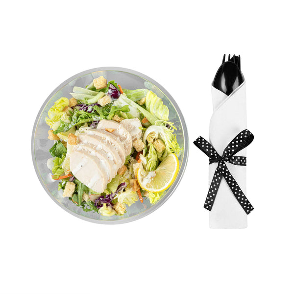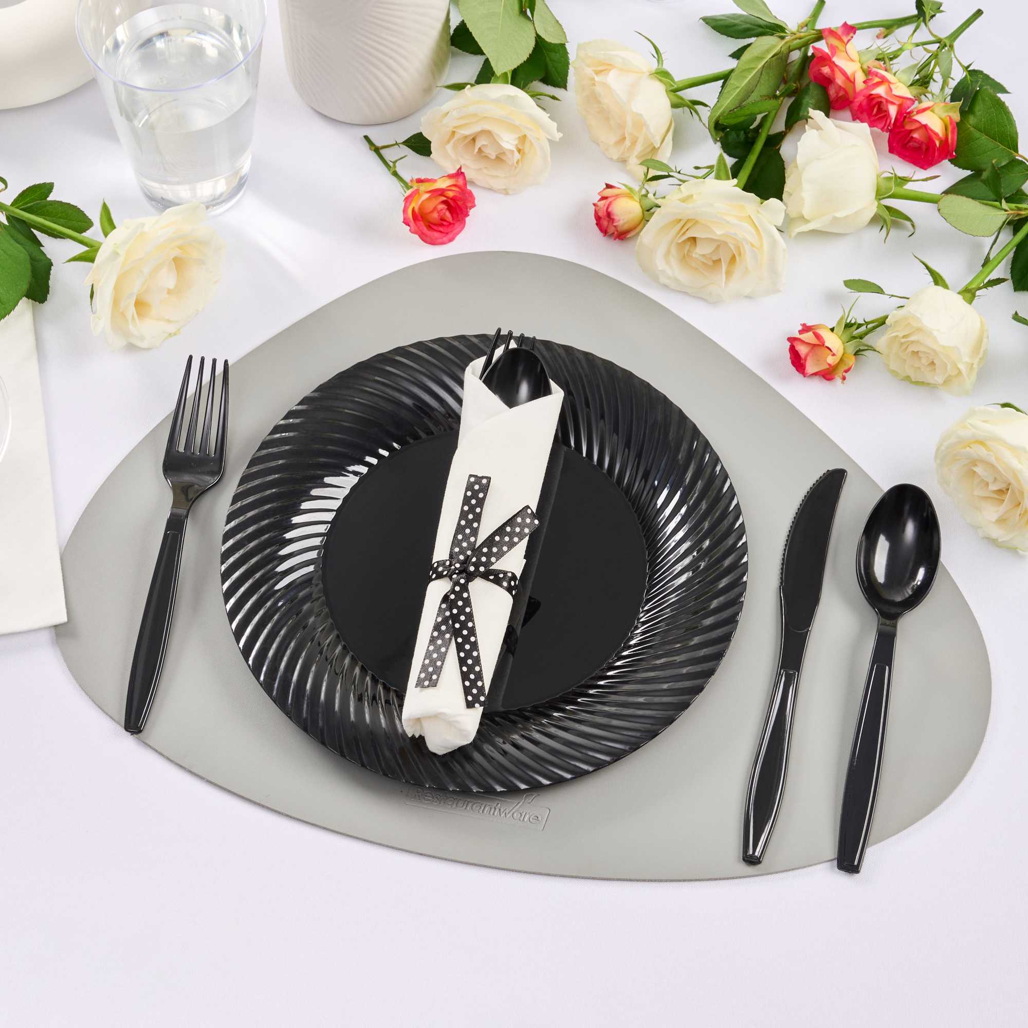 Get functional and beautiful flatware all-in-one with our Argento Black Plastic Cutlery Sets. Featuring a spoon, fork, and knife in each set, these plastic utensils are ideal for coordinating with any delicious dish. Crafted from premium plastic, this plastic silverware is recyclable and provides quick and easy post-event cleanup. Each plastic cutlery set is tied with a charming black and white polka dot ribbon to effortlessly complement the decor of your cafe, bistro, or catering event. With durable construction, these disposable cutlery sets do not bend or break easily. Packaged with a high-quality napkin, these sturdy plastic dining sets allow guests to enjoy their food while avoiding messes. The plastic silverware in each set measures 7.25 inches long. Shipped in a 100 count box.