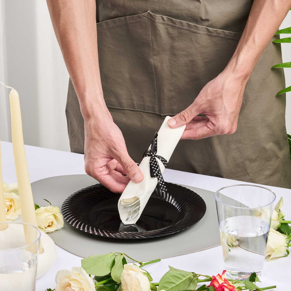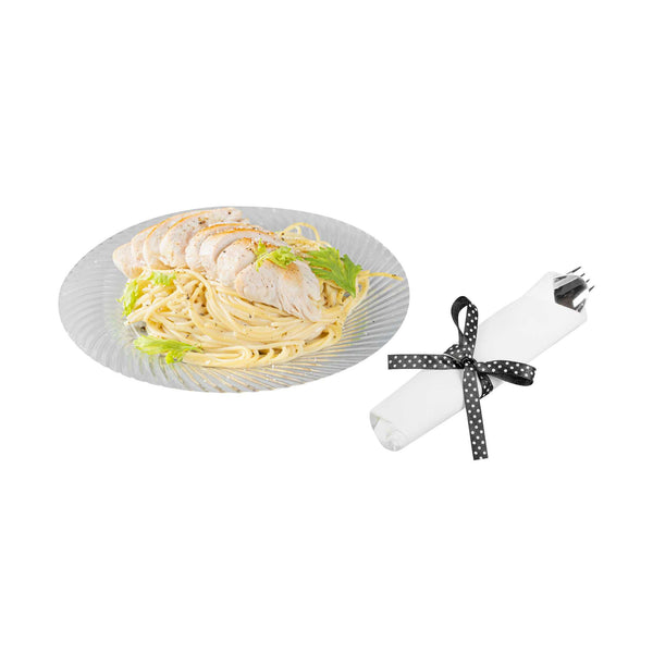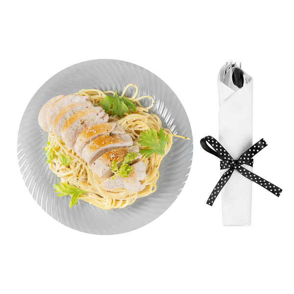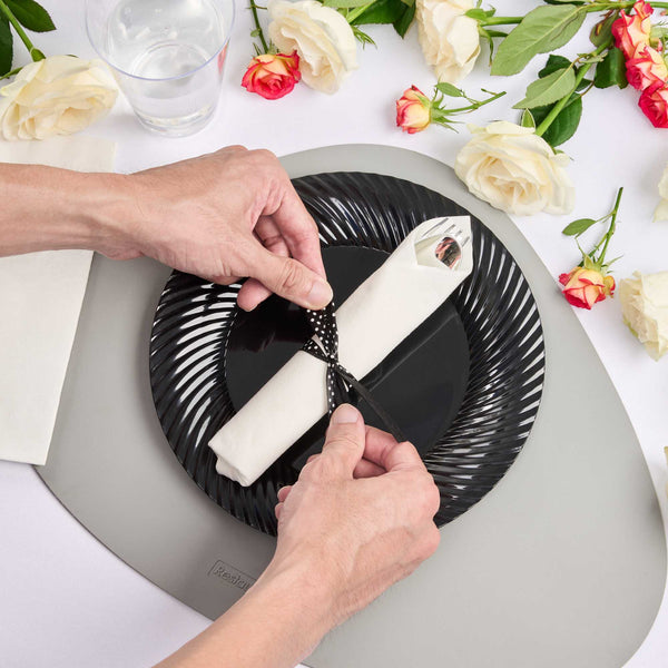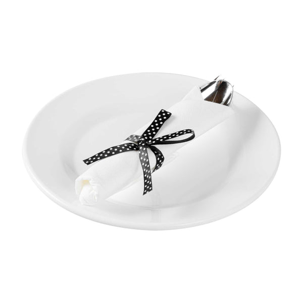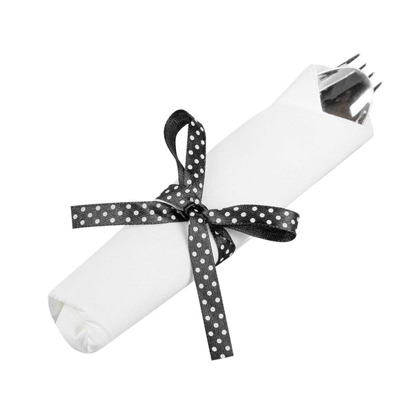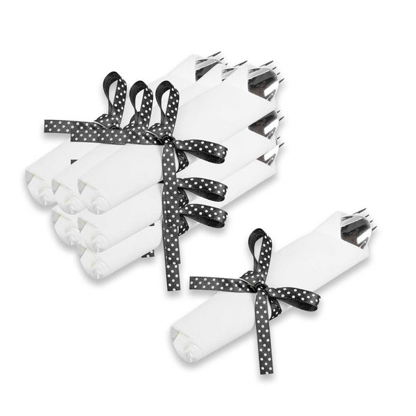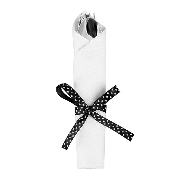 Get premium silverware without the hefty price with our Wrapped Argento Silver Cutlery Sets with Black Polka Dot Ribbons. Featuring a high-quality white napkin, these silver plastic cutlery sets are convenient options for guests to use at your cafe, restaurant, catering event, and more. With a spoon, fork, and knife in each set, this plastic silverware set is great for coordinating with delicious dishes from appetizers to desserts. Constructed from premium plastic, these durable silver plastic utensils are recyclable. Tied with a charming black polka dot ribbon, these disposable sets instantly enhance the decor of any venue. This silver plastic silverware measures 7.3 inches long by 2 inches wide and ships in a 100-count box.