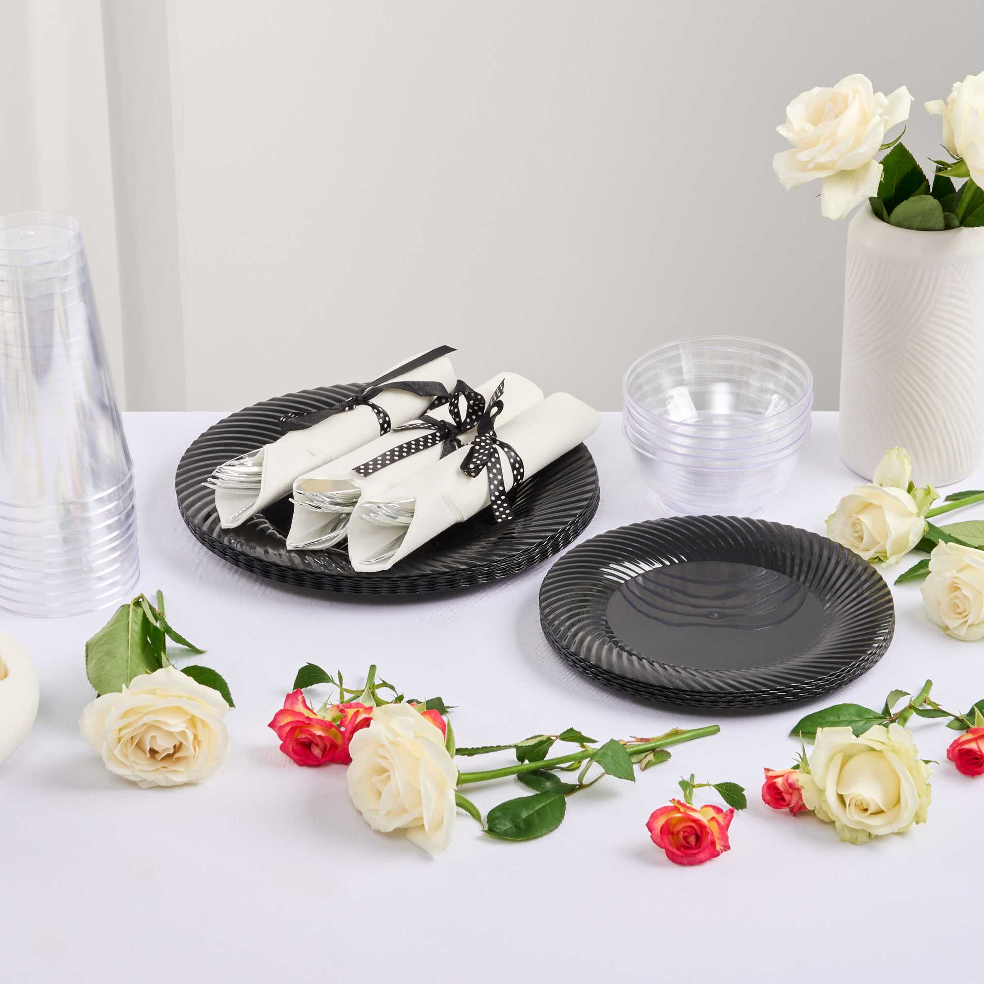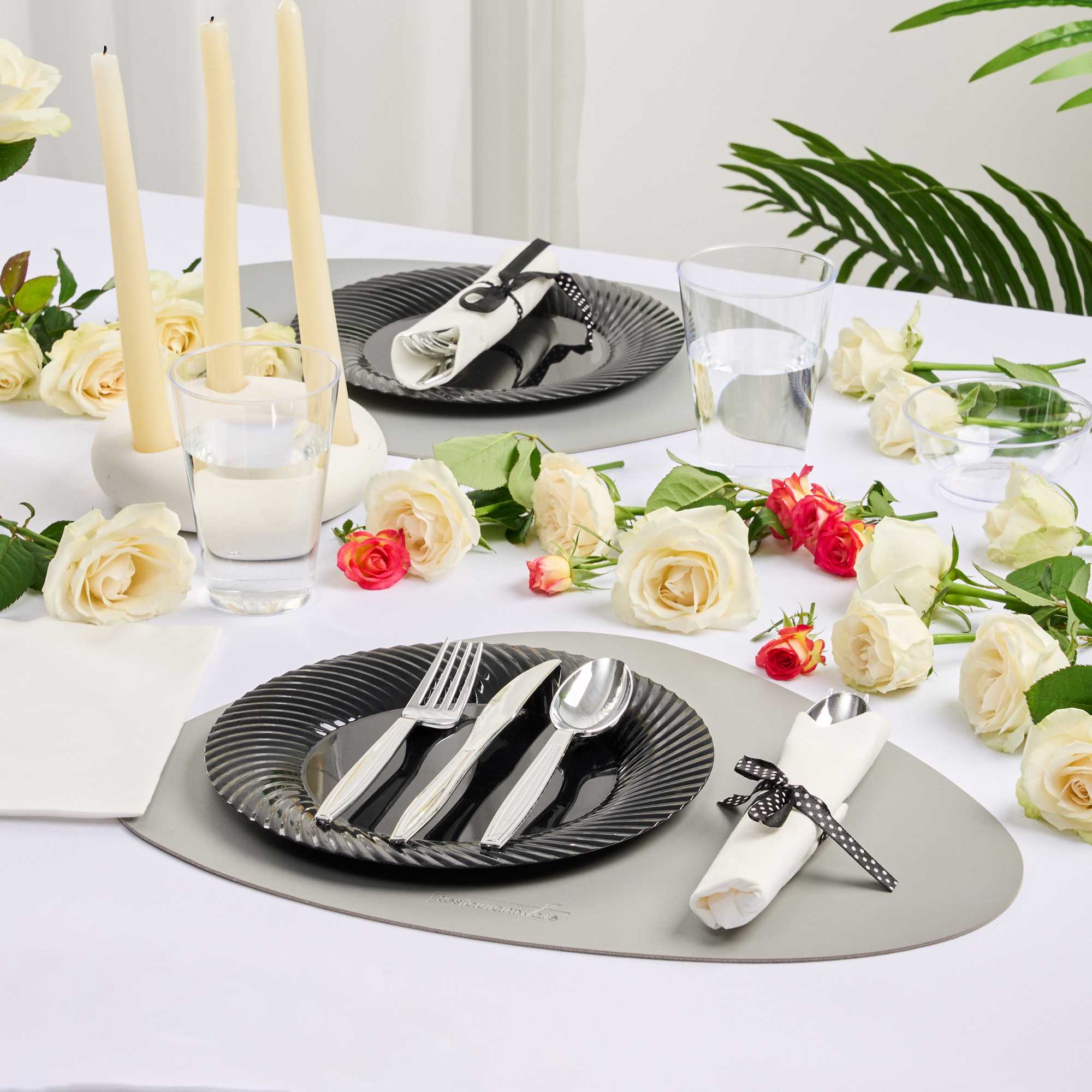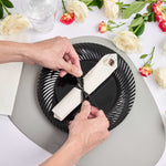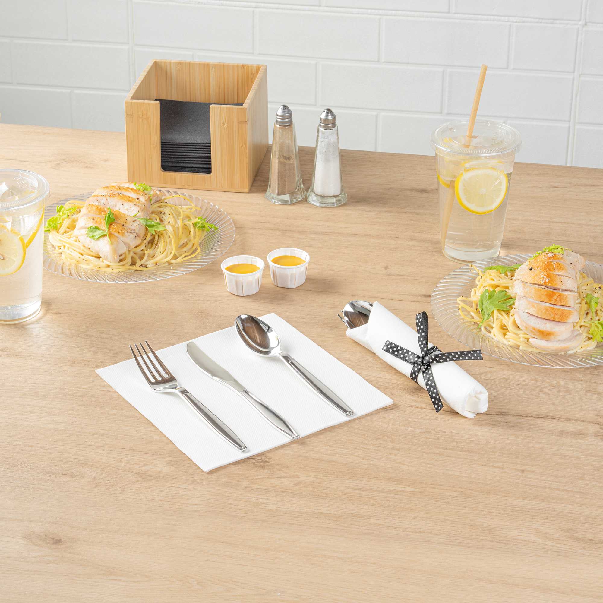 Get premium silverware without the hefty price with our Wrapped Argento Silver Cutlery Sets with Black Polka Dot Ribbons. Featuring a high-quality white napkin, these silver plastic cutlery sets are convenient options for guests to use at your cafe, restaurant, catering event, and more. With a spoon, fork, and knife in each set, this plastic silverware set is great for coordinating with delicious dishes from appetizers to desserts. Constructed from premium plastic, these durable silver plastic utensils are recyclable. Tied with a charming black polka dot ribbon, these disposable sets instantly enhance the decor of any venue. This silver plastic silverware measures 7.3 inches long by 2 inches wide and ships in a 100-count box.