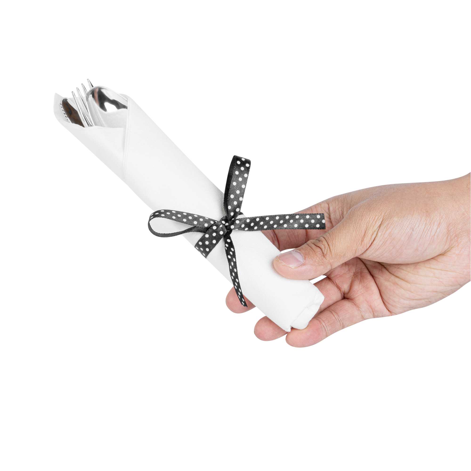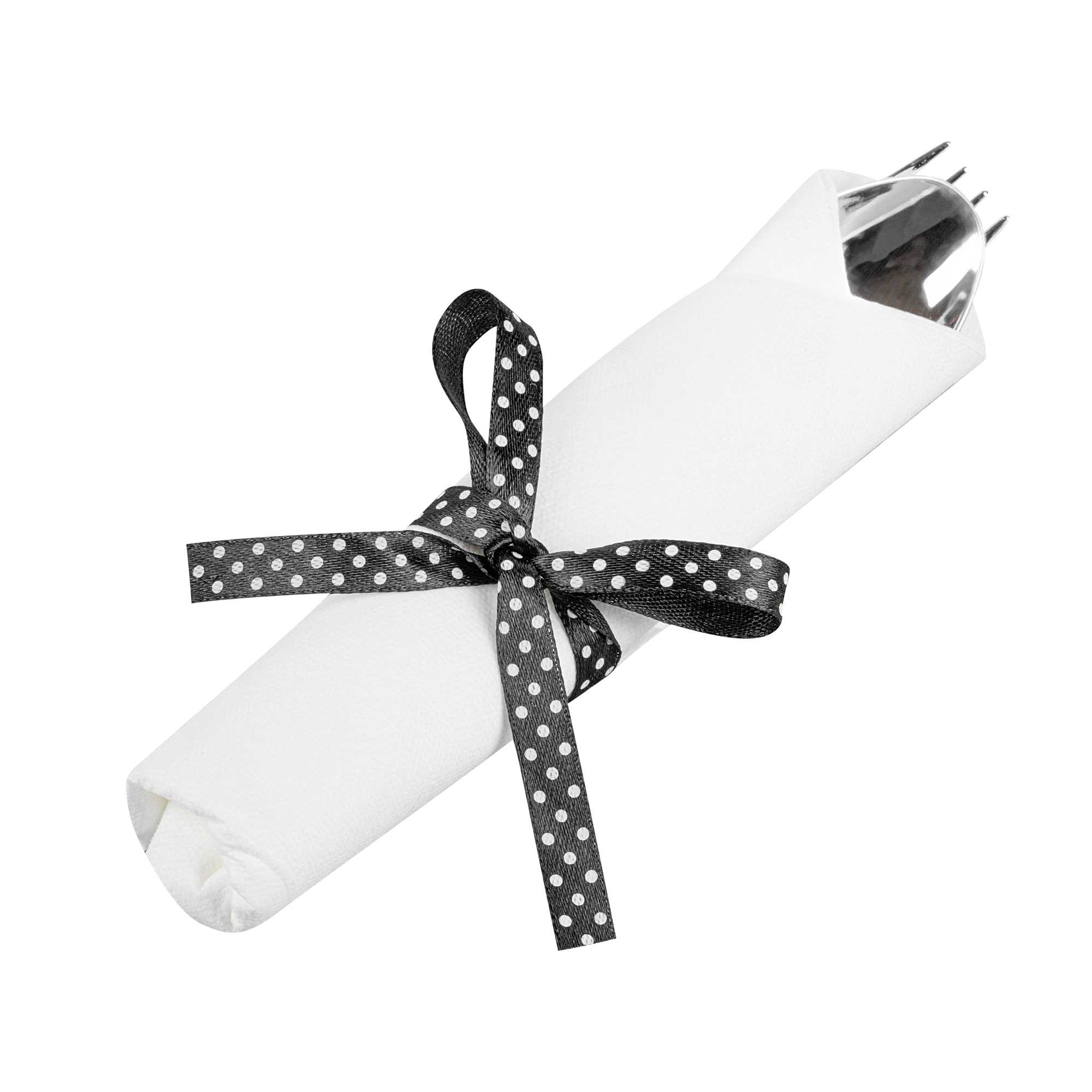 SILVER PLASTIC CUTLERY SET - WITH WHITE NAPKIN, POLKA DOT RIBBON
