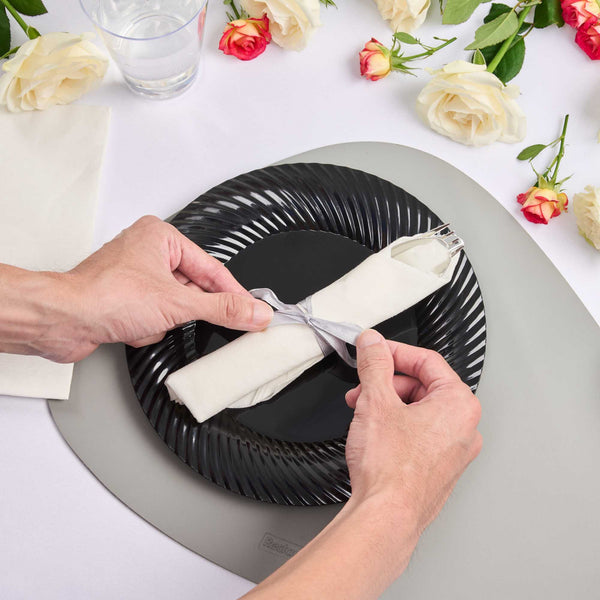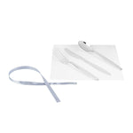 - Silver ribbon securely holds cutlery set while adding a charming look