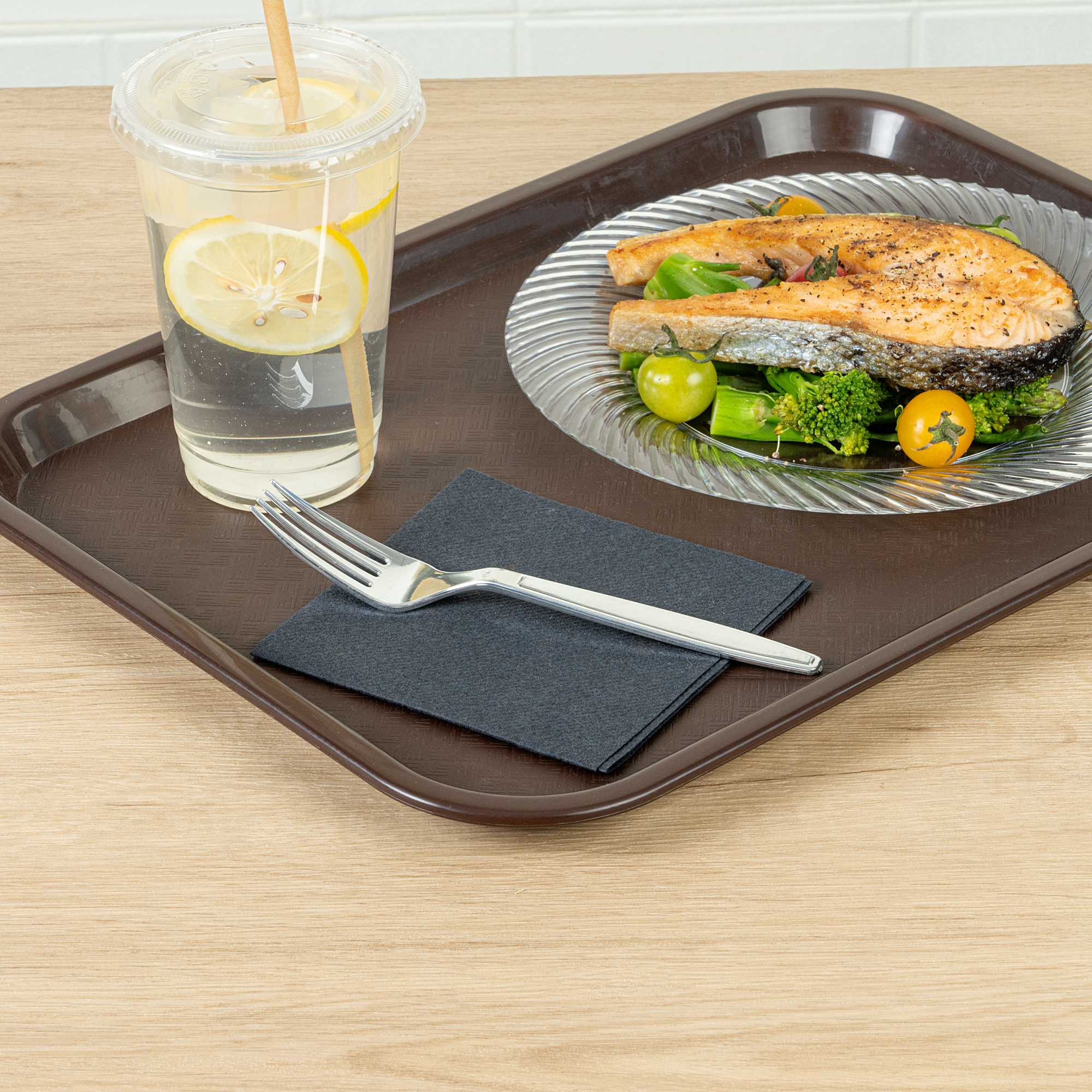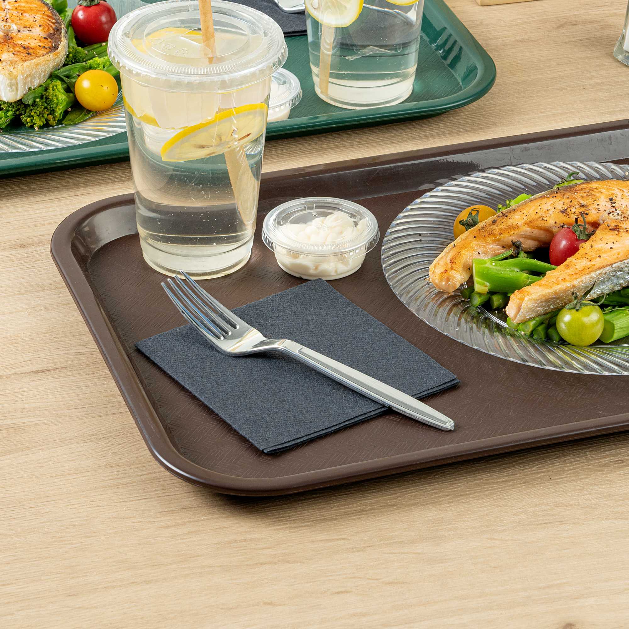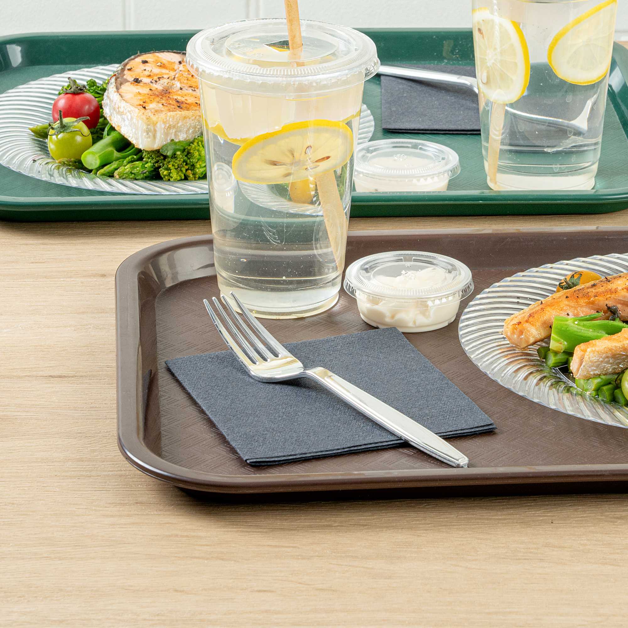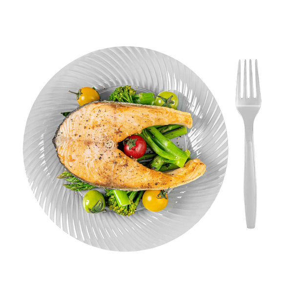 Stylishly present delicious entrees with our Argento Silver Plastic Forks. These traditional forks are the perfect solution for serving alongside slices of wedding cake, desserts, or main courses. Crafted from high-quality plastic, these long disposable forks are exceptionally sturdy and built to withstand pressure without bending or breaking. These sturdy plastic forks are ideal for serving dry desserts and wet dishes like meatballs or salads, ensuring reliable performance with every bite. After use, simply dispose of these recyclable forks, eliminating the need for washing and drying. Each silver fork measures 7 inches in length, providing a convenient utensil option. Sold in a 250 count box.